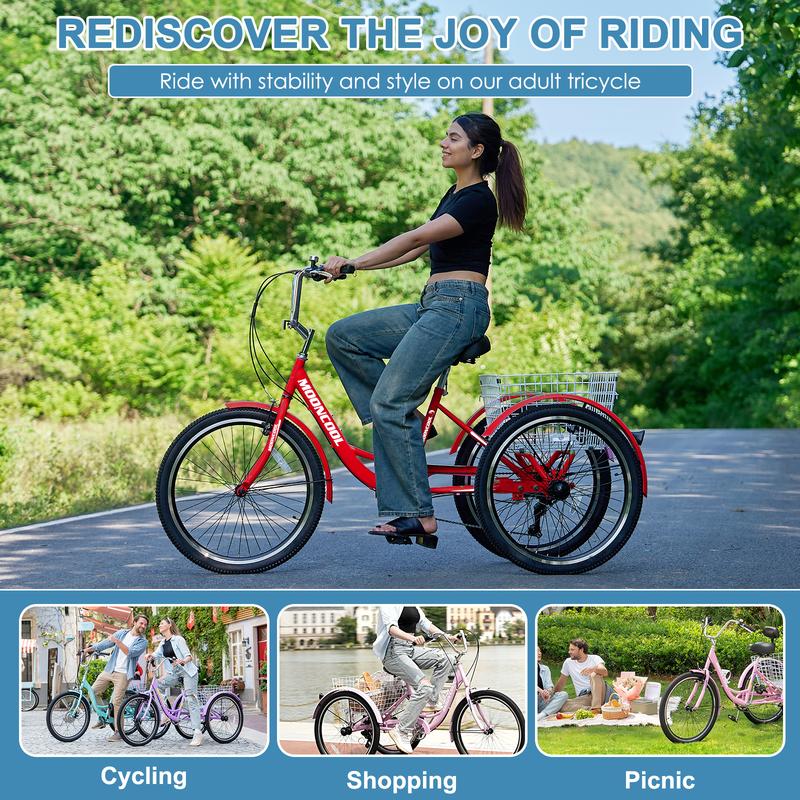 MOONCOOL tricycle has a large rear basket, load up the conveniently basket with pets,groceries, supplies, or whatever suits your daily shopping while staying in shape. Perfect for ride the bike wherever you want to go, picnic, visit relatives and friends, or go out with your little puppy. You can ride safely and comfortably on town streets, beaches or bike lanes.