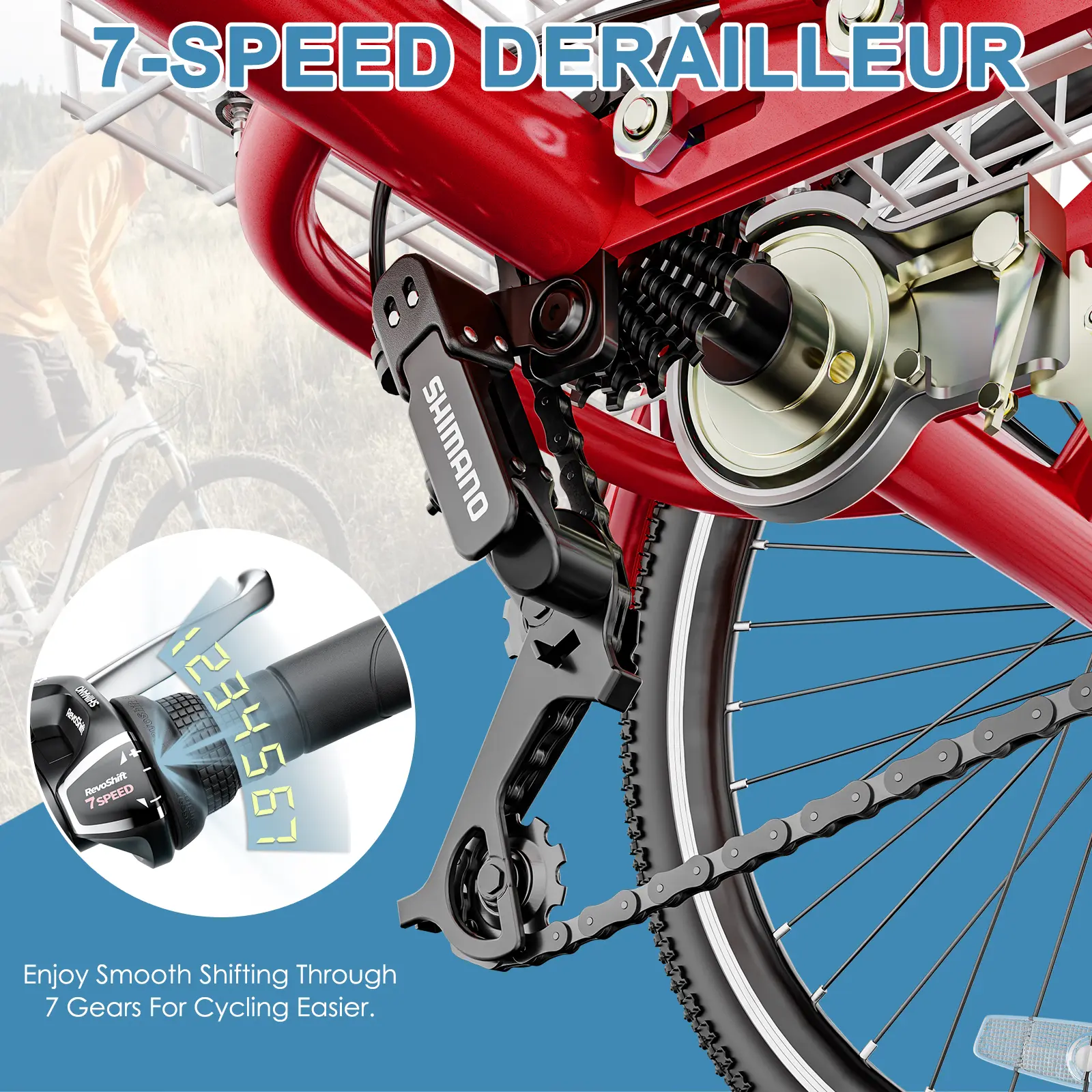 γPremium shimano derailleur, Upgrade Parking Brake LeverγThe flexible 7-speed rear derailleur allows you to change speeds freely and easily in any emergency. Front V and rear brakes, even if you carry heavy goods, the all wheel brake system can effectively controls the downhill speed to ensure safety.You can use it with confidence.