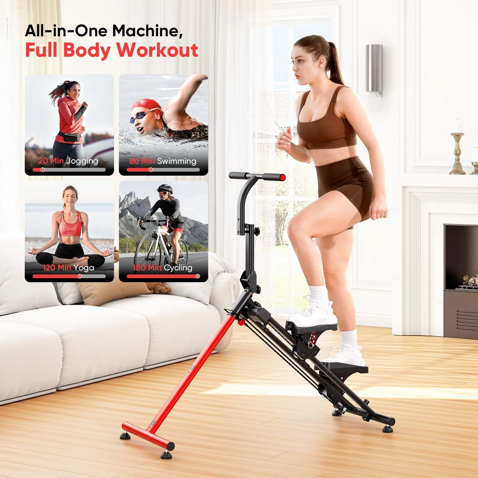 Experience a variety of workout modes including climbing, incline hiking, and ski simulation. These modes are perfect for cardio endurance, lower body toning, and full-body workouts. Ideal for low-impact HIIT targeting legs, glutes, and core muscles.