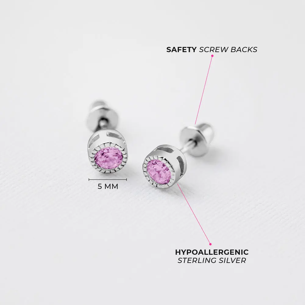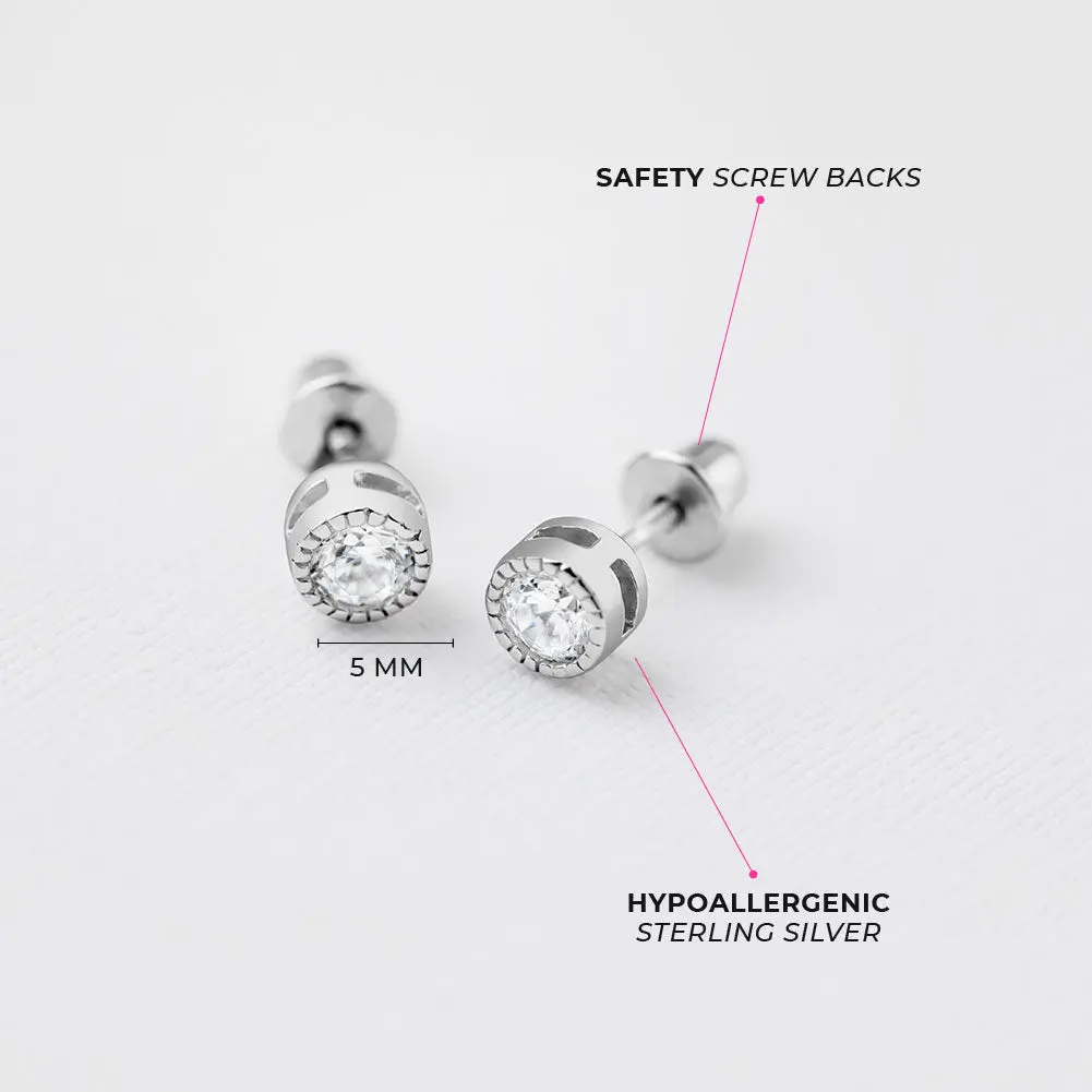 5. Trim Bezel Round CZ 5mm Baby / Toddler / Kids Earrings Screw Back - Sterling Silver