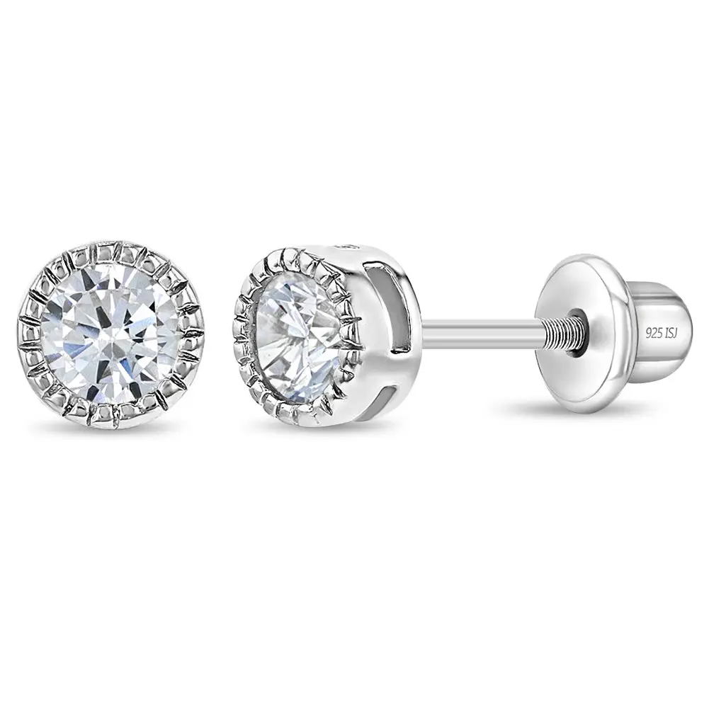 Trim Bezel Round CZ 5mm Baby / Toddler / Kids Earrings Screw Back - Sterling Silver