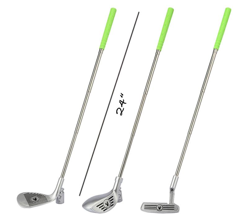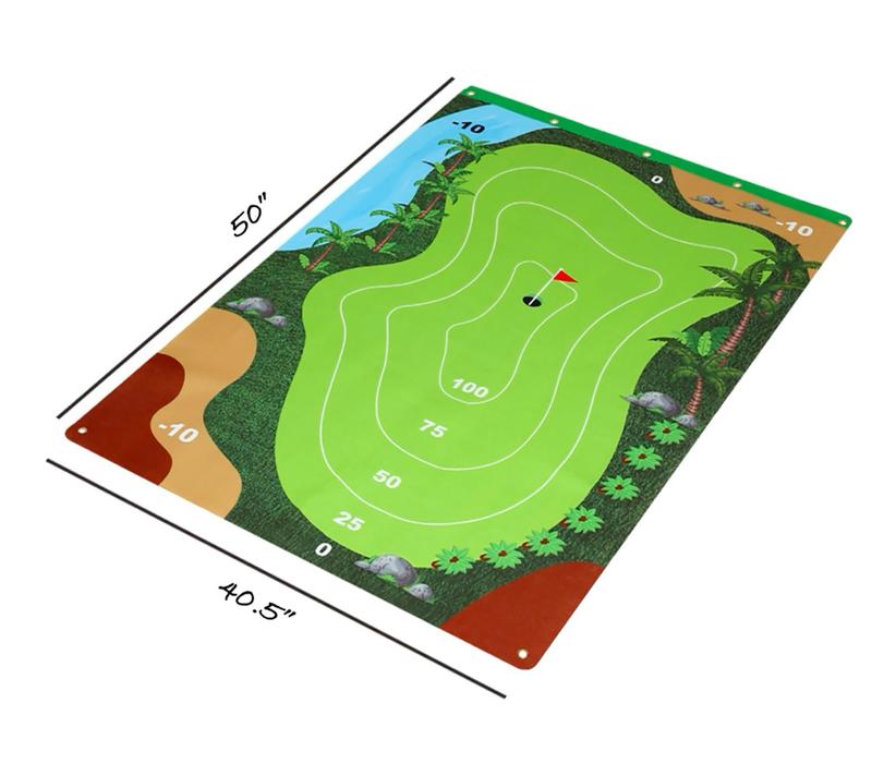 ·Includes club mat, chipping mat, three golf clubs, 20 golf balls, two golf holes, four ground stakes, four hooks, mesh bag, scoreboard, and marker