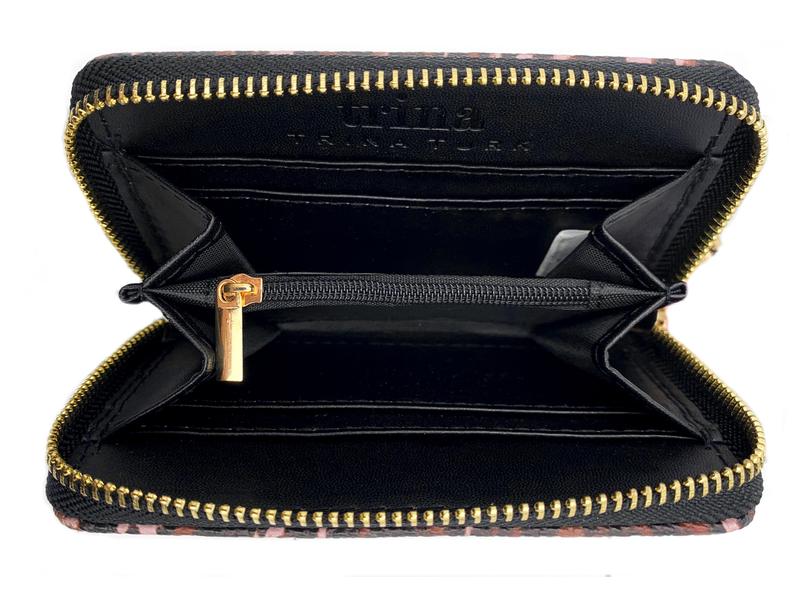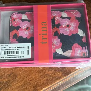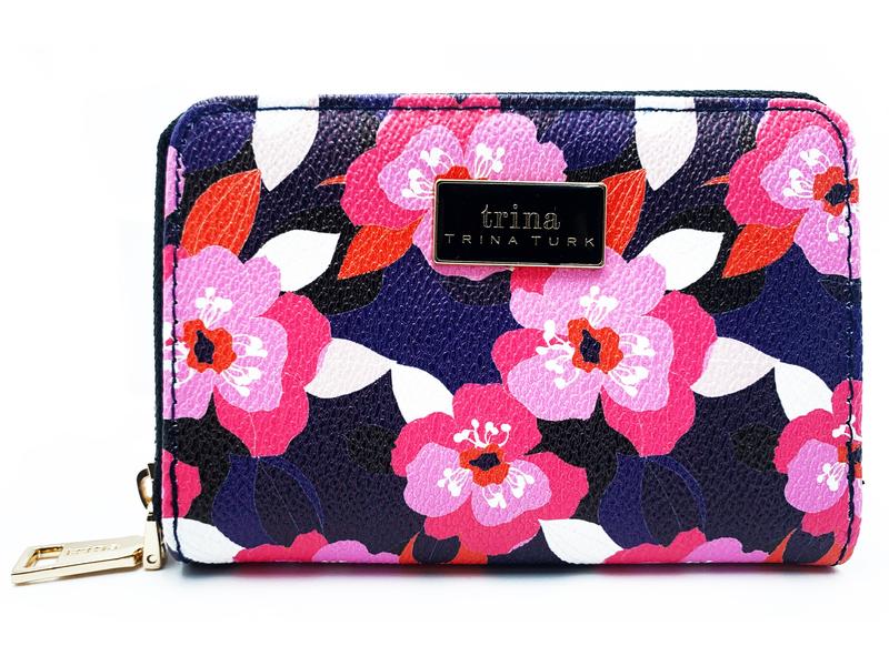 Elegant Design: The Trina Turk Small Printed wallets are a stylish accessory. It's made with vegan leather and features unique colorful prints. Perfect for carrying coins, it's both functional and fashionable.