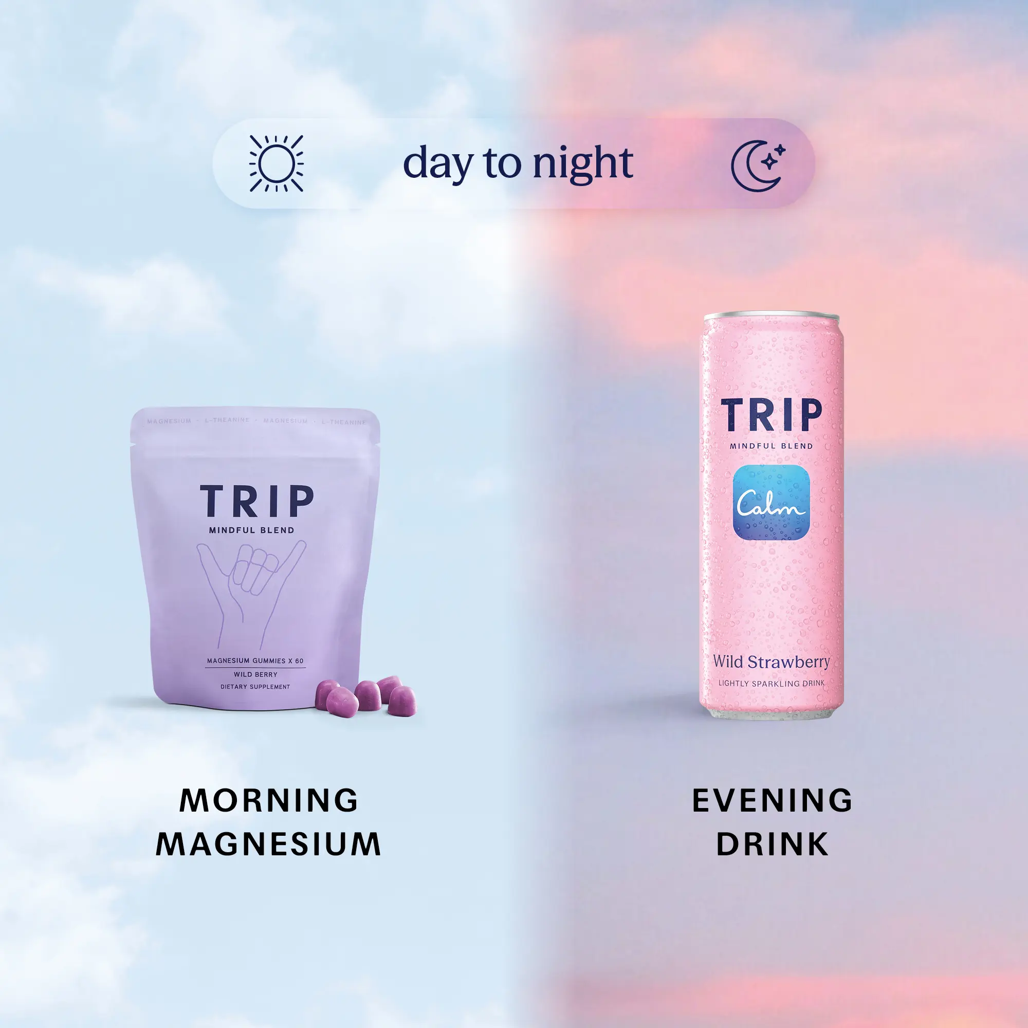 Find your balance with the TRIP Total Calm Bundle. This duo pairs our sophisticated Wild Strawberry Adaptogen Lightly Sparkling Drink with our high-potency Wild Berry Magnesium Gummies. Whether you need a refreshing social alternative or a daily wellness boost, this science-backed pair is designed to help you navigate modern life with ease.