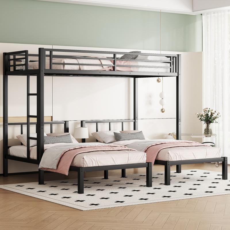 This metal twin over twin & twin bunk bed is an excellent space saver because it can be used for 3 children. It is the perfect solution for extended family, guests, or hosting your child's friends for a sleepover. A shelf on the upper bed can be used for storing clothes and other accessories. You can also turn the upper bed into a twin XL bed with this shelf. There is a small table in the middle of the two beds on the lower level, which can be used to place commonly used items or books. I believe that this metal twin over twin & twin bunk bed will bring you a different experience.
