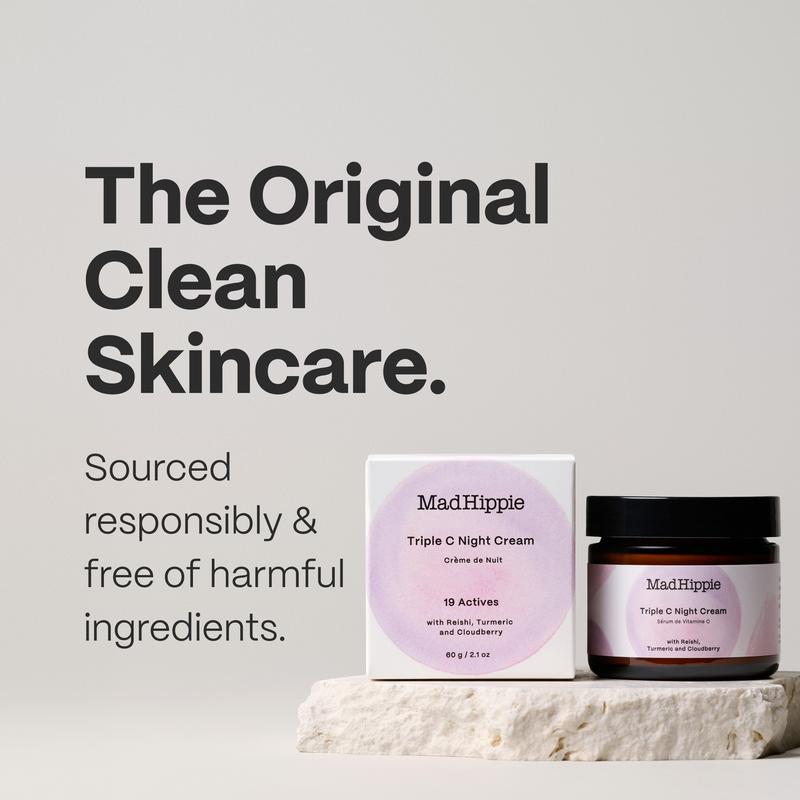 Mad Hippie Triple C Night Cream is a rich, rejuvenating moisturizer formulated with three potent forms of bioavailable vitamin C to target signs of aging overnight. Tetrahexyldecyl Ascorbate, Magnesium Ascorbyl Phosphate, and Ascorbyl Glucoside work together to brighten, firm, and reduce the appearance of wrinkles. Enhanced with adaptogens like reishi and turmeric, it calms and soothes skin, while antioxidants offer protection. Ideal for all skin types, this cream absorbs smoothly, leaving your skin nourished, balanced, and visibly radiant by morning.