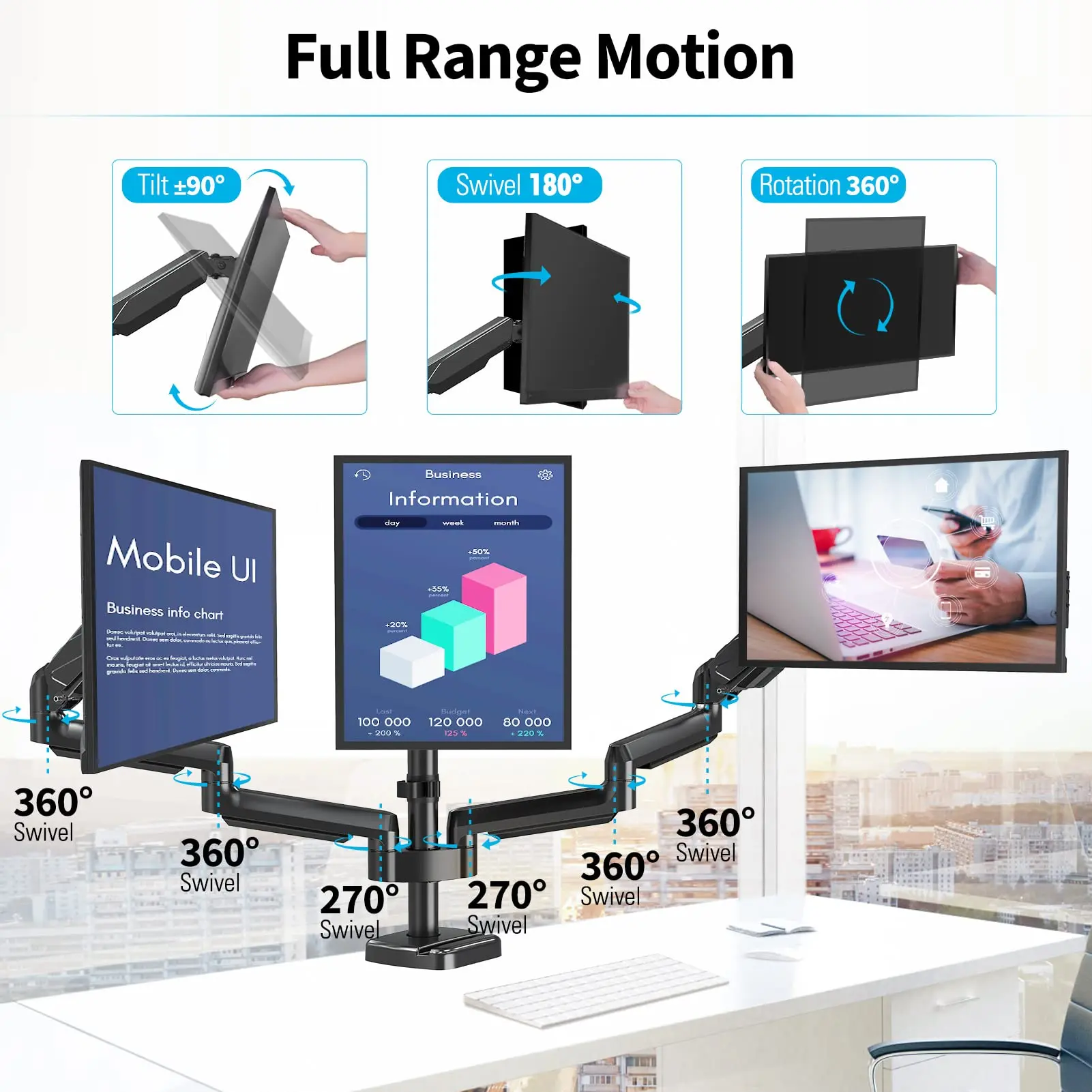 5. MOUNTUP 13"-27'' Triple Monitor Arm Gas Spring Desk Mount, Clamp&Grommet Desk Mount, MU0006A