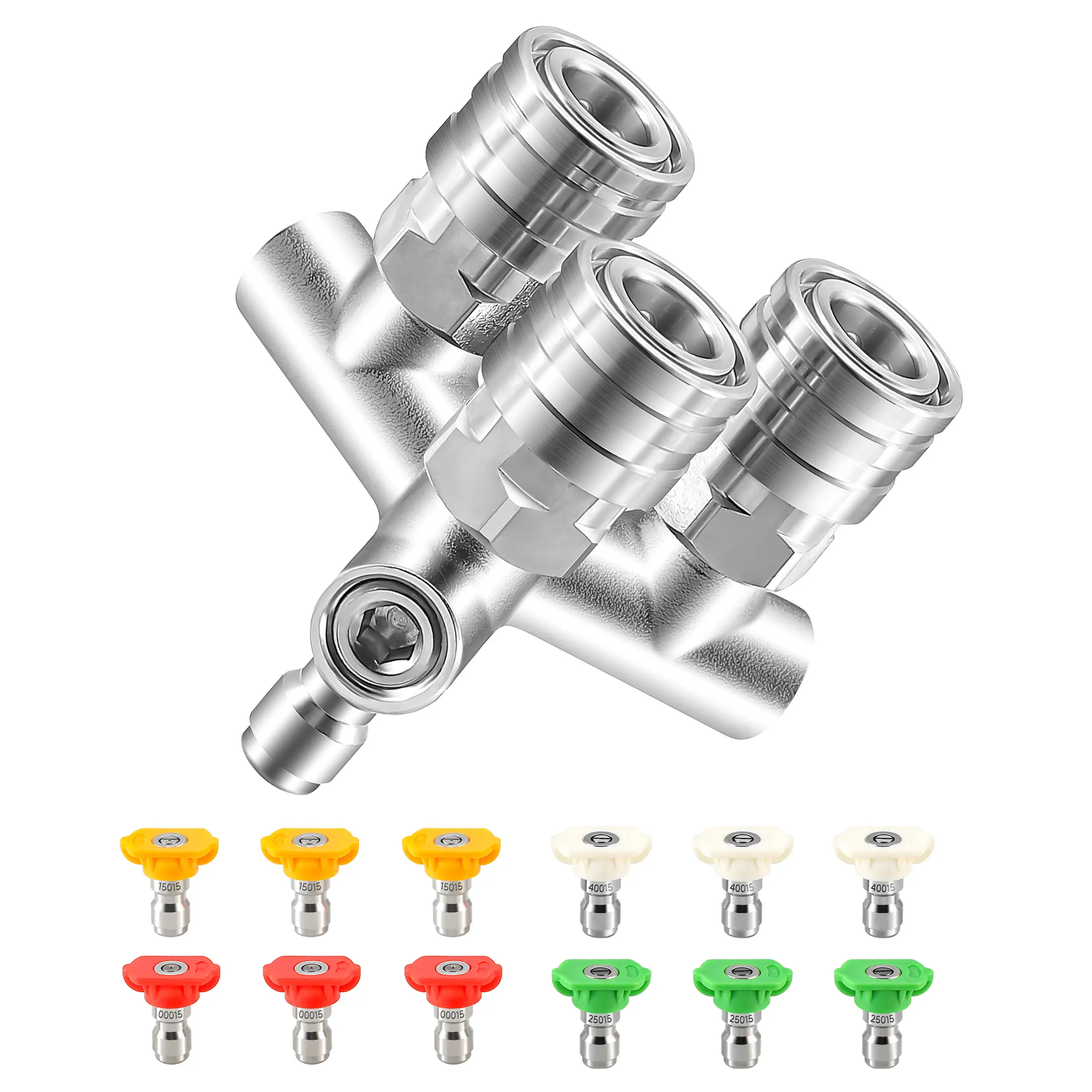 ·Package Includes: 1 × Triple Pressure Washer Nozzle; 3 × 0° Red Nozzles; 3 × 15°Yellow Nozzles; 3 × 25°Green Nozzles; 3 × 40°White Nozzles; EZALOR specializes in durable, high-performance pressure washer tools designed to handle any cleaning challenge with ease and efficiency. Trust EZALOR for quality you can rely on.