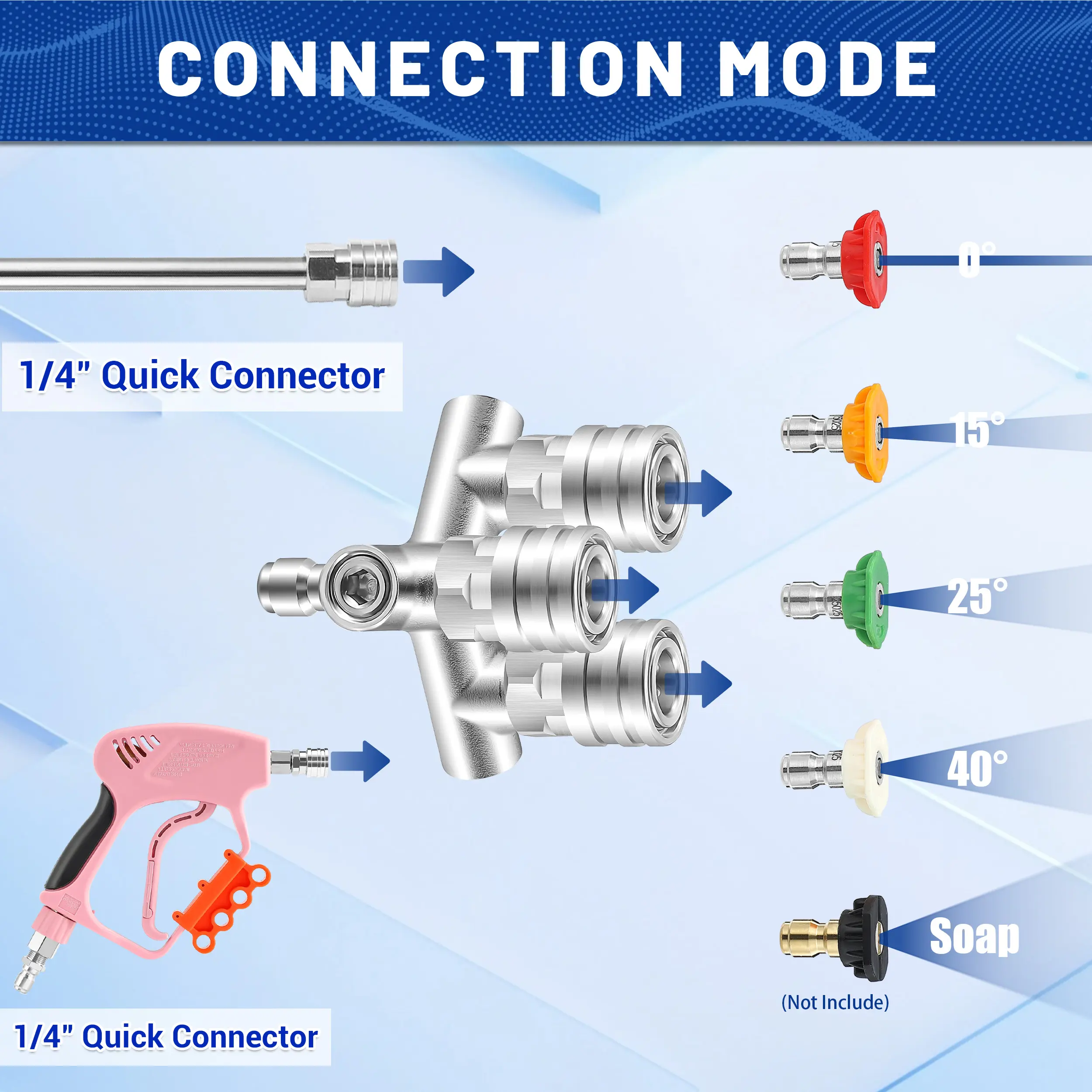 ·Quick & Convenient Connection: Equipped with a 1/4-inch quick-connect fitting, this pressure washer nozzle allows for fast and secure attachment to most pressure washer spray lances and wands. It supports multi-angle cleaning and is compatible with standard 1/4-inch color-coded nozzles.