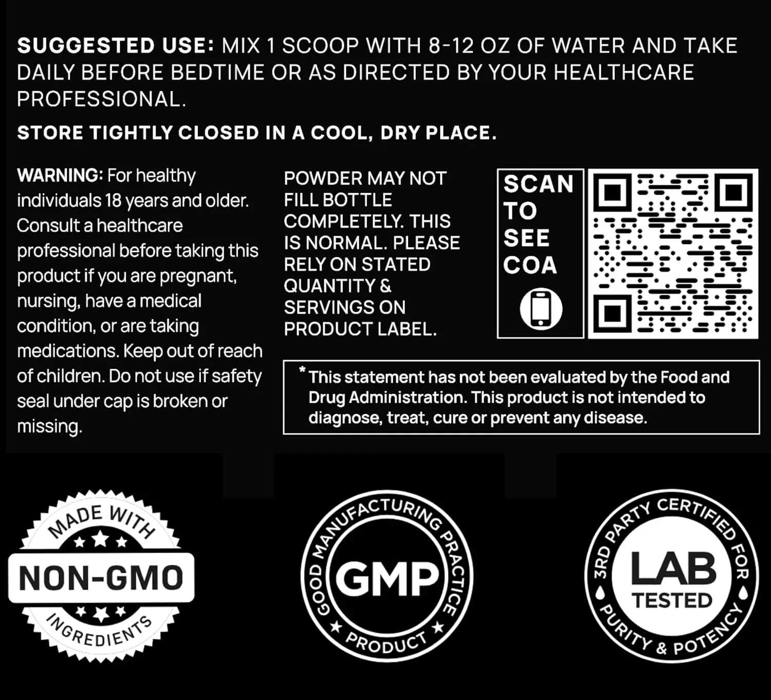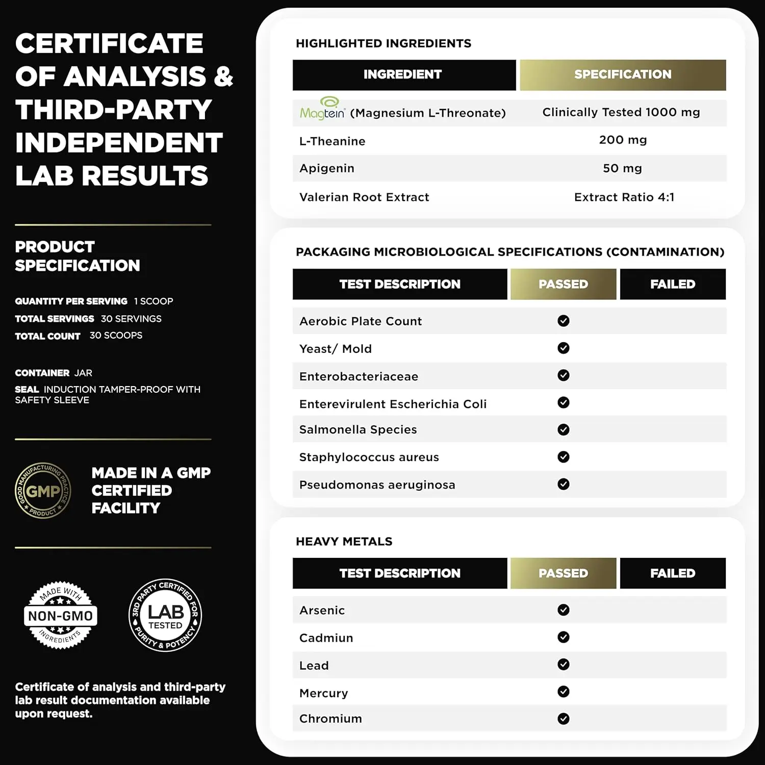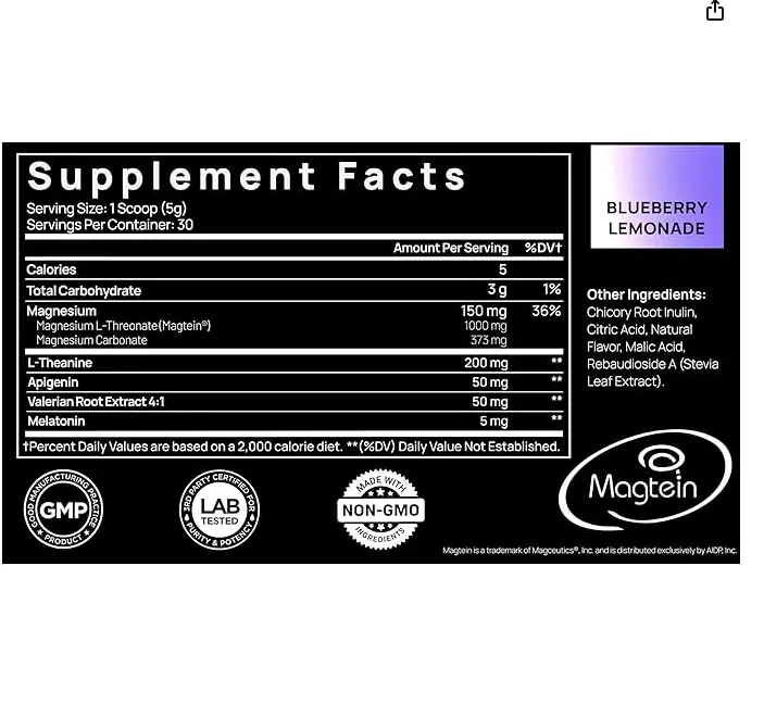 ·INGREDIENTS: Magtein Magnesium L-Threonate | 1,000mg, Magnesium Carbonate | 373mg, L-Theanine | 200mg, Apigenin | 50mg, Valerian Root 4:1 Extract | 50mg, Melatonin | 5mg.