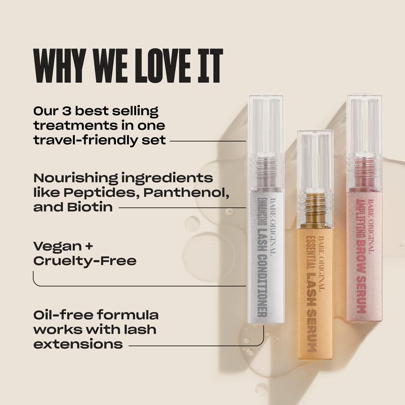 Say HELLO to your best lashes and brows ever in just weeks with this super limited set. This powerhouse trio of mini-but-mighty best sellers includes a 6 week supply of Essential Lash Serum, Enhancing Lash Conditioner, and Amplifying Brow Serum. The perfect pick for travel.