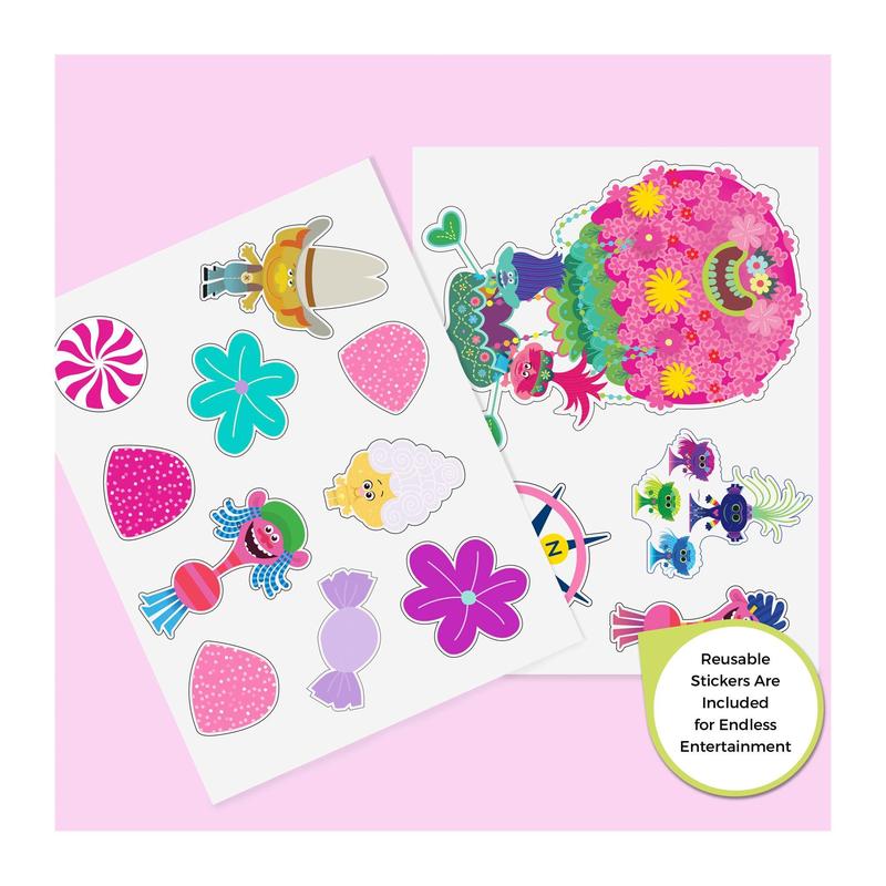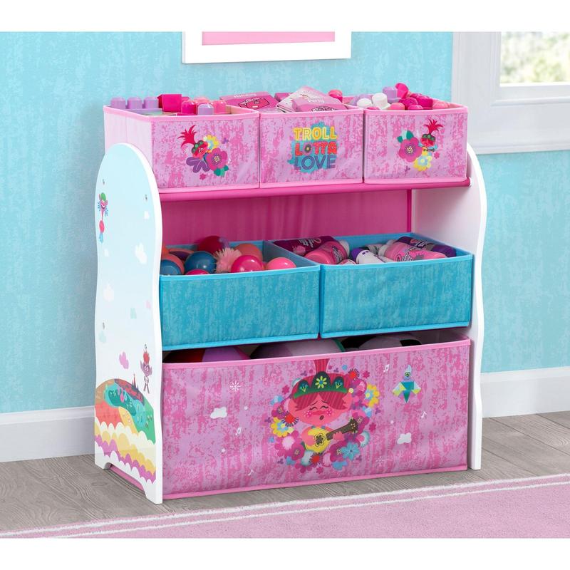Your little one's playroom or bedroom will be clutter-less and as cute as can be with this Trolls World Tour storage organizer. Six fabric bins hold and hid toys, shoes, books, crafts, and so much more, all in a super-fun three-shelf organizer featuring colorful Trolls graphics. Plus reusable cling stickers let your child decorate to their delight over and over again. From Delta Children.