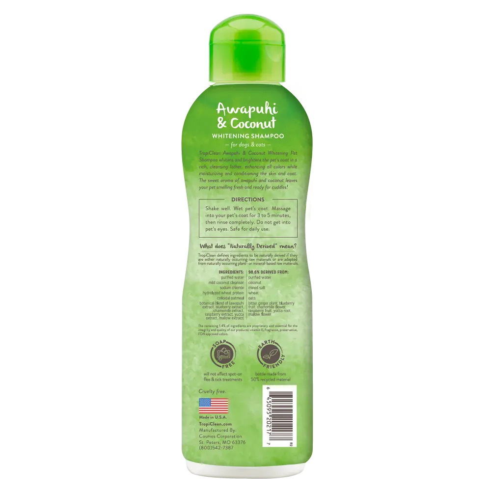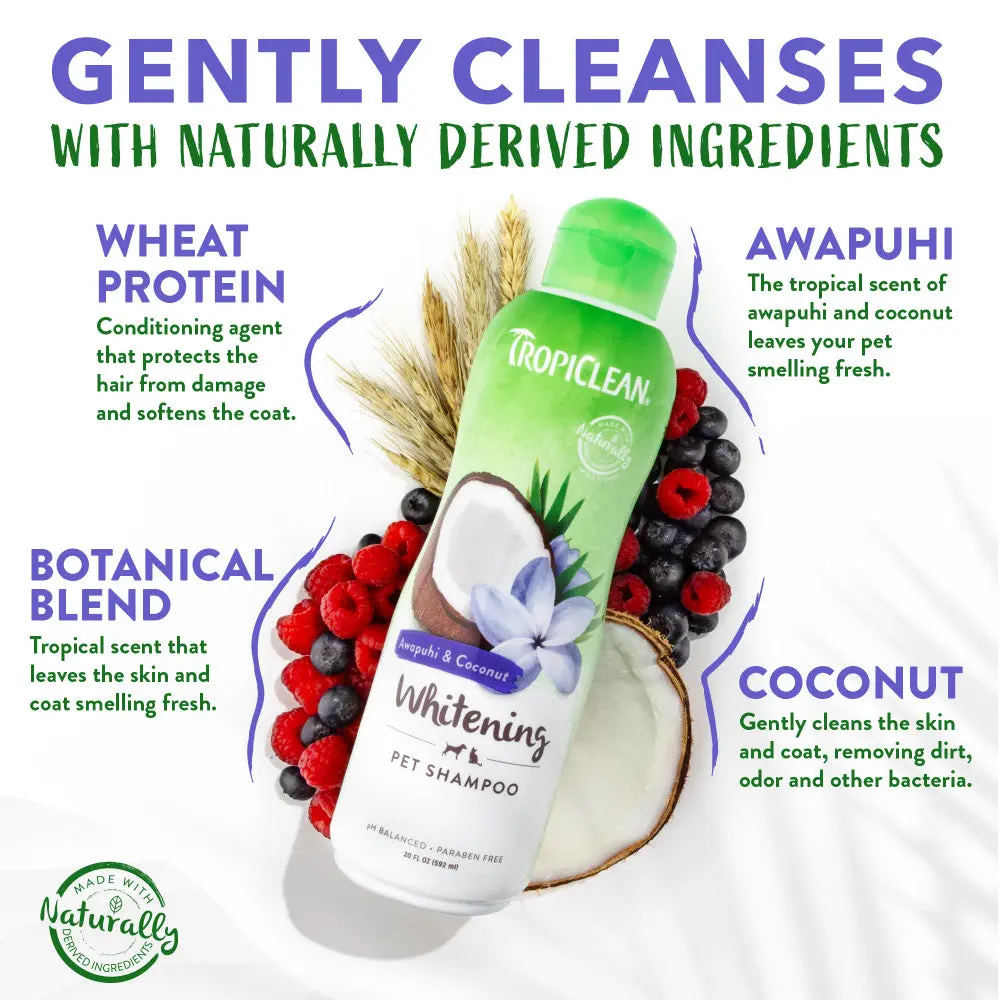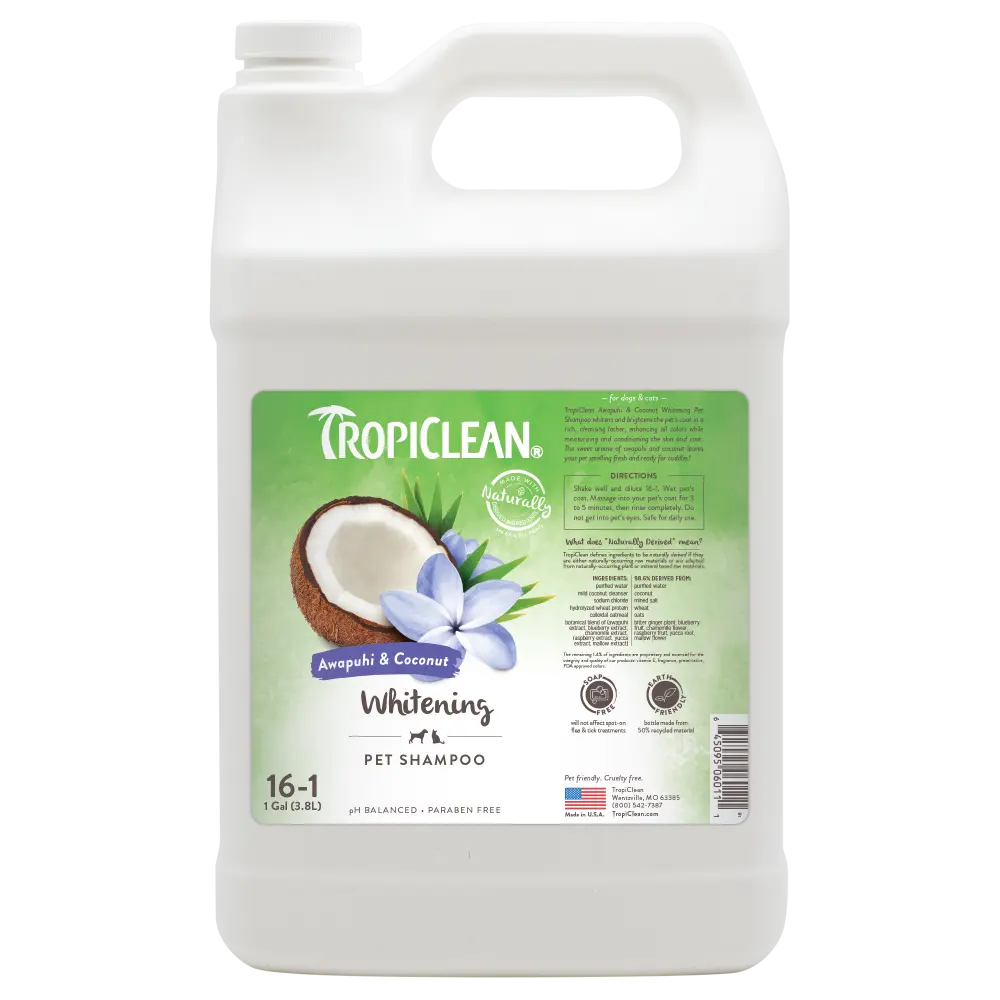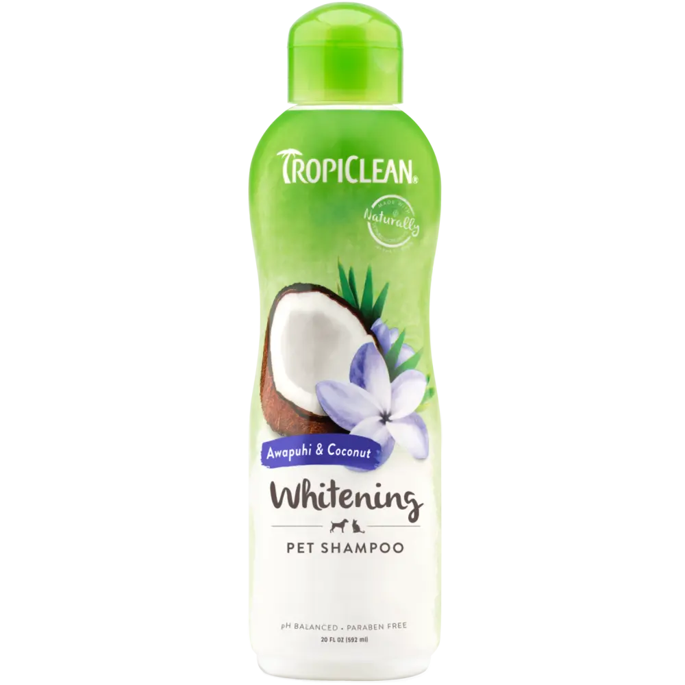 Bring out your pet’s natural brilliance with TropiClean Awapuhi & Coconut Whitening Shampoo for dogs and cats. Formulated to gently cleanse, whiten, and brighten coats of all colors—especially white or light fur—this luxurious pet shampoo creates a rich, tropical lather that lifts dirt while deeply moisturizing skin and coat.