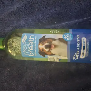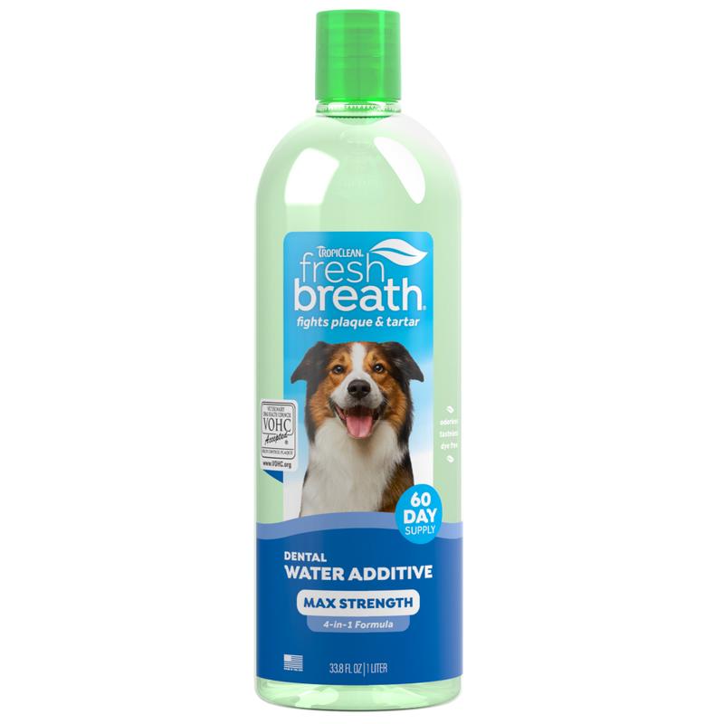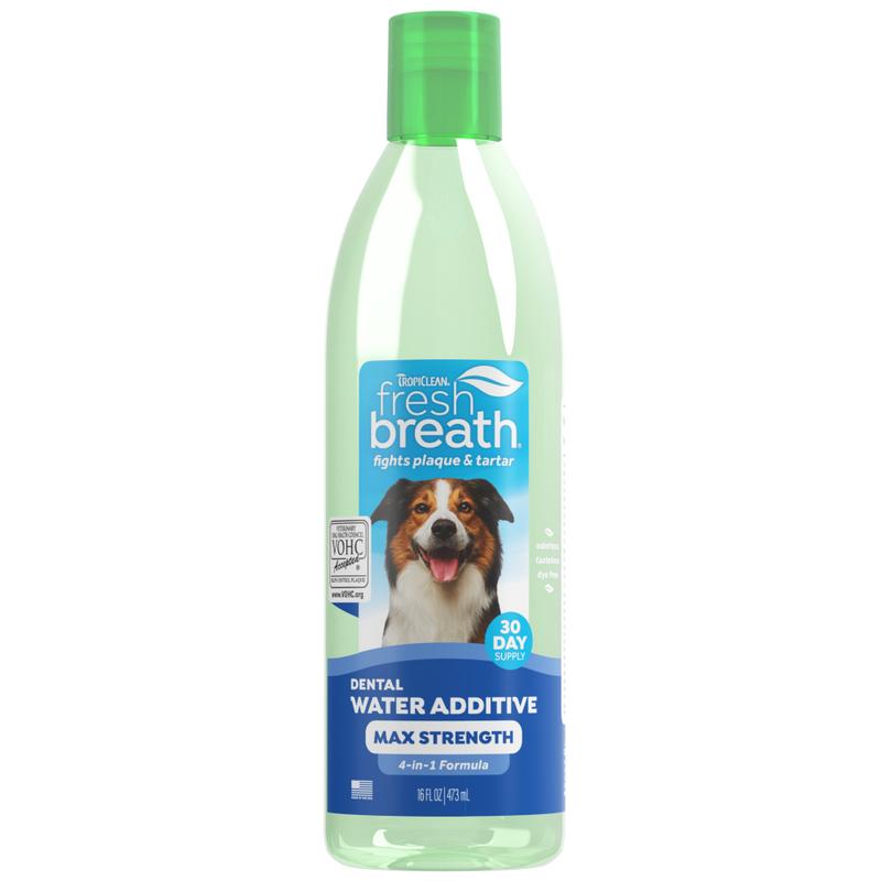 TropiClean Fresh Breath Max Strength Dental Water Additive for Dogs delivers a powerful boost to your dog’s oral care—no brushing required. This advanced 4-in-1 dental formula helps fight plaque and tartar, brighten teeth, and keep breath fresh for up to 12 hours. Simply add to your dog’s water bowl daily for easy, stress-free dental support. Made with naturally derived ingredients and free from sulfates, parabens, dyes, and artificial colors. Cruelty free. Made in the USA.