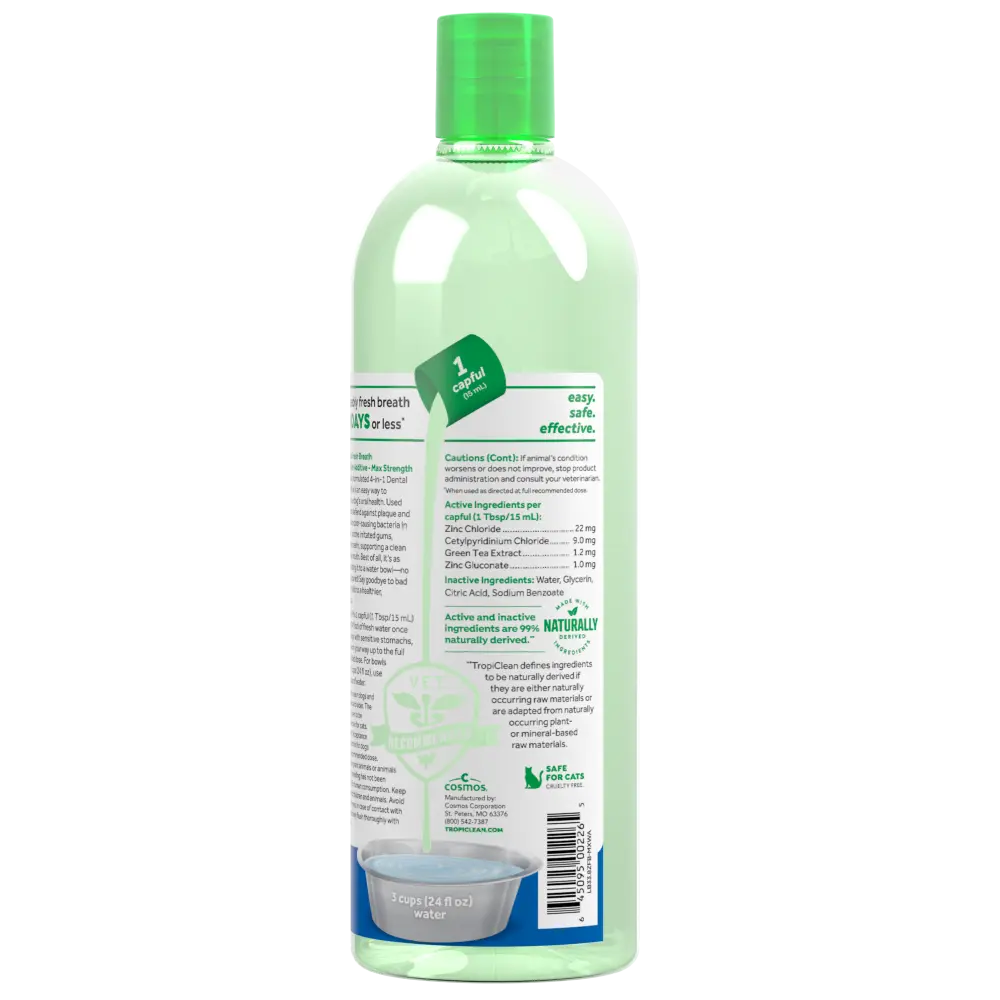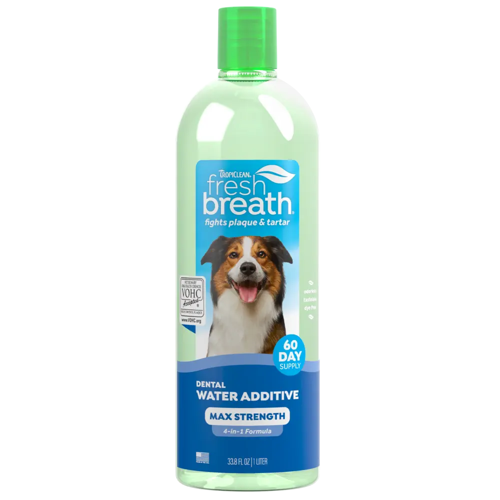 TropiClean Fresh Breath Max Strength Dental Water Additive for Dogs delivers a powerful boost to your dog’s oral care—no brushing required. This advanced 4-in-1 dental formula helps fight plaque and tartar, brighten teeth, and keep breath fresh for up to 12 hours. Simply add to your dog’s water bowl daily for easy, stress-free dental support. Made with naturally derived ingredients and free from sulfates, parabens, dyes, and artificial colors. Cruelty free. Made in the USA. Also available in 16oz bottles.