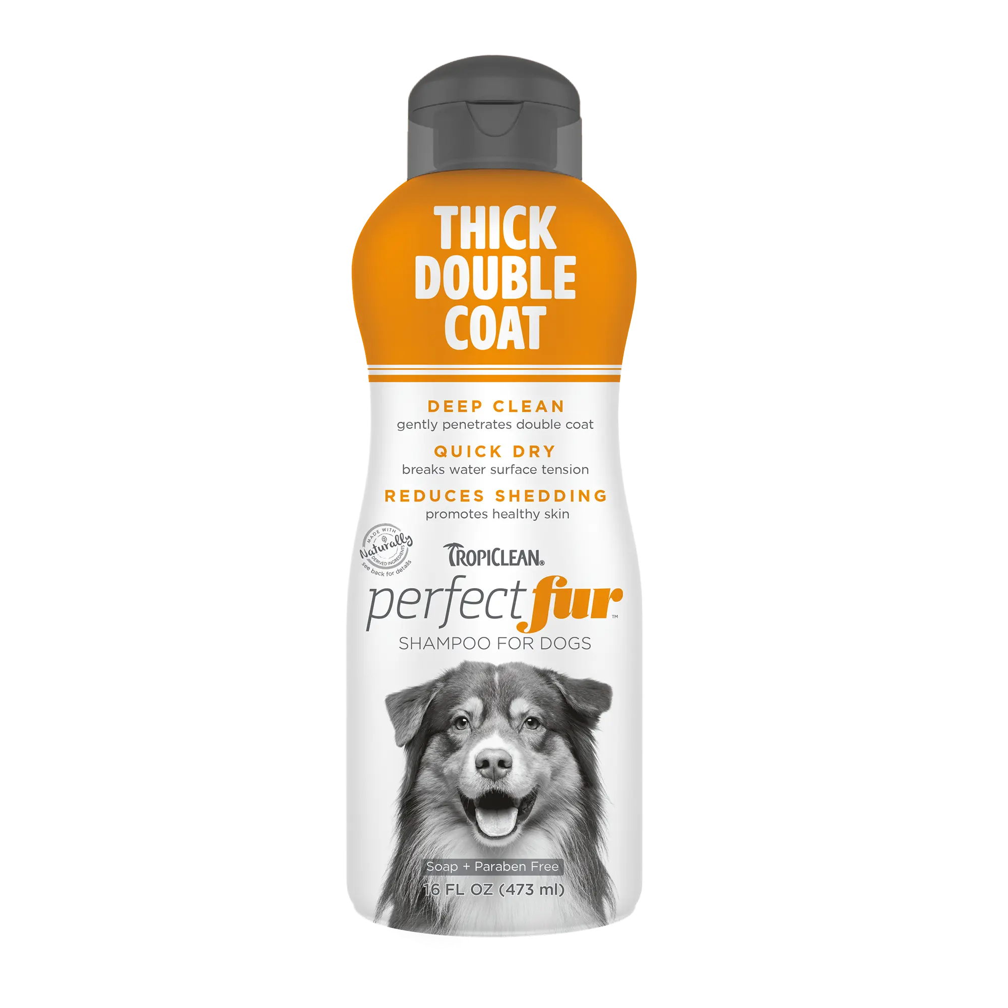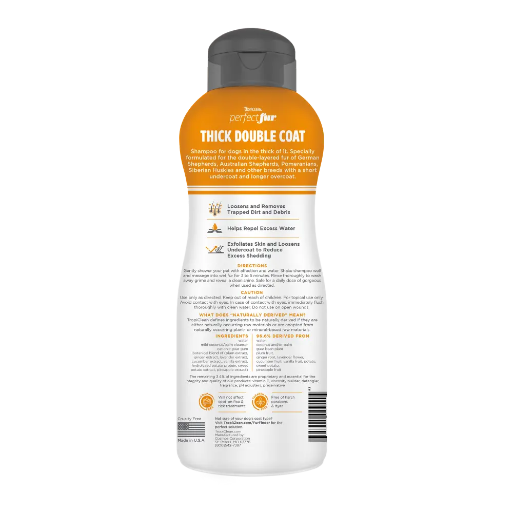 TropiClean PerfectFur™ Thick Double Coat Shampoo for Dogs is formulated for breeds like German Shepherds, Huskies, Pomeranians, and Australian Shepherds with dense, double-layered coats. This deep-cleansing shampoo penetrates both layers, exfoliating skin and loosening undercoat to reduce shedding while removing trapped dirt and debris. With quick-dry technology, it repels water, cuts drying time, and leaves your dog’s coat refreshed with a bright citrus scent. Made with naturally derived ingredients, this gentle, soap- and paraben-free formula promotes healthy skin and a soft, tangle-free coat. Like all of TropiClean dog grooming products, this dog shampoo is cruelty free and made in the USA.