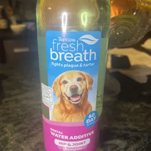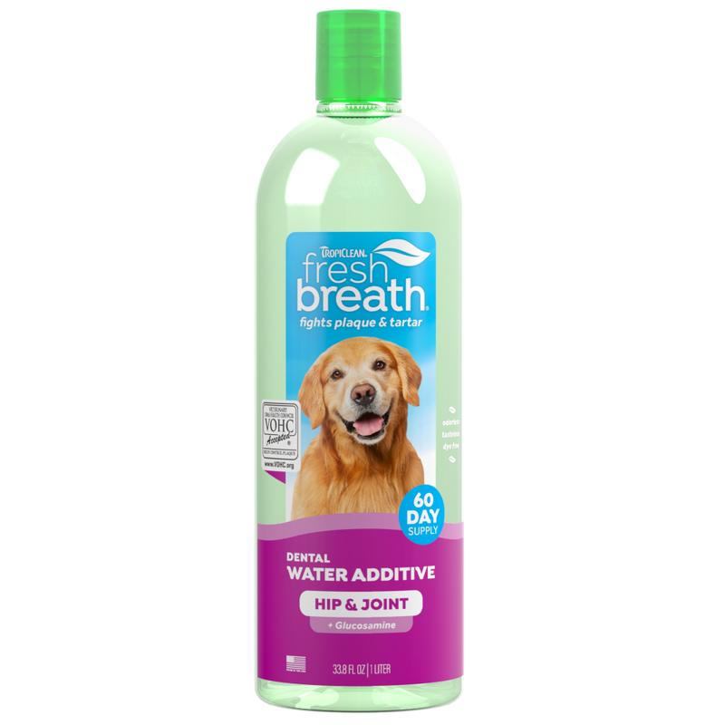 Fresh Breath by TropiClean Oral Care Water Additive + Hip & Joint Support for Pets is the easy, no-brush solution to keep your pet’s mouth healthy while supporting their mobility. Formulated with glucosamine to promote your pet's healthy hips and joints, this tasteless water additive also provides daily plaque and tartar defense for dogs and cats—simply add it to their water bowl once a day. In just 14 days, it helps reduce plaque and tartar build-up while freshening breath for up to 12 hours.
