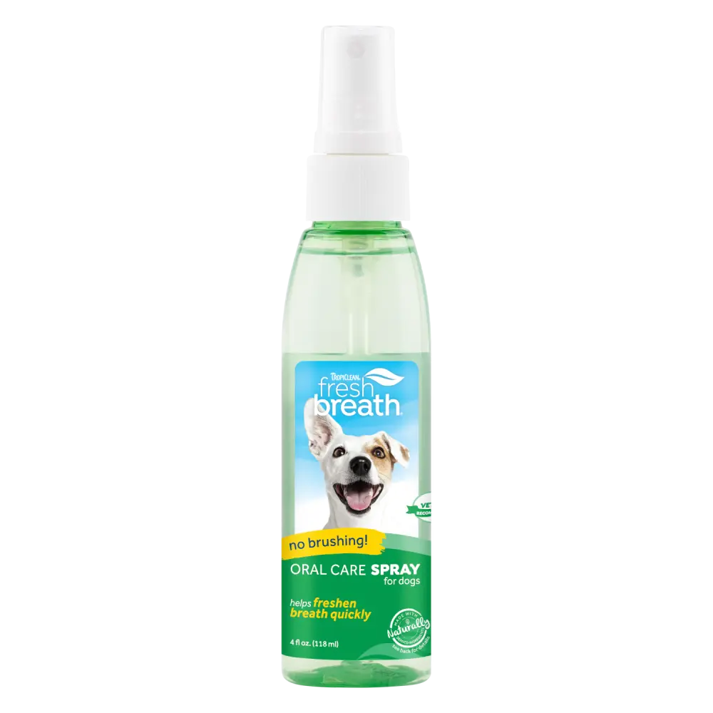 TropiClean Fresh Breath Oral Care Spray for Pets instantly transforms bad pet breath into minty freshness with just one quick spray. Perfect for cats and dogs, this easy-to-use dog and cat breath spray eliminates stinky kisses, promoting fresh breath and better oral hygiene—without the hassle of a toothbrush. Formulated with powerful, naturally derived ingredients, it helps reduce plaque and tartar buildup while reaching areas brushing can miss. Simply spray directly onto your pet’s teeth and gums for instant freshness.