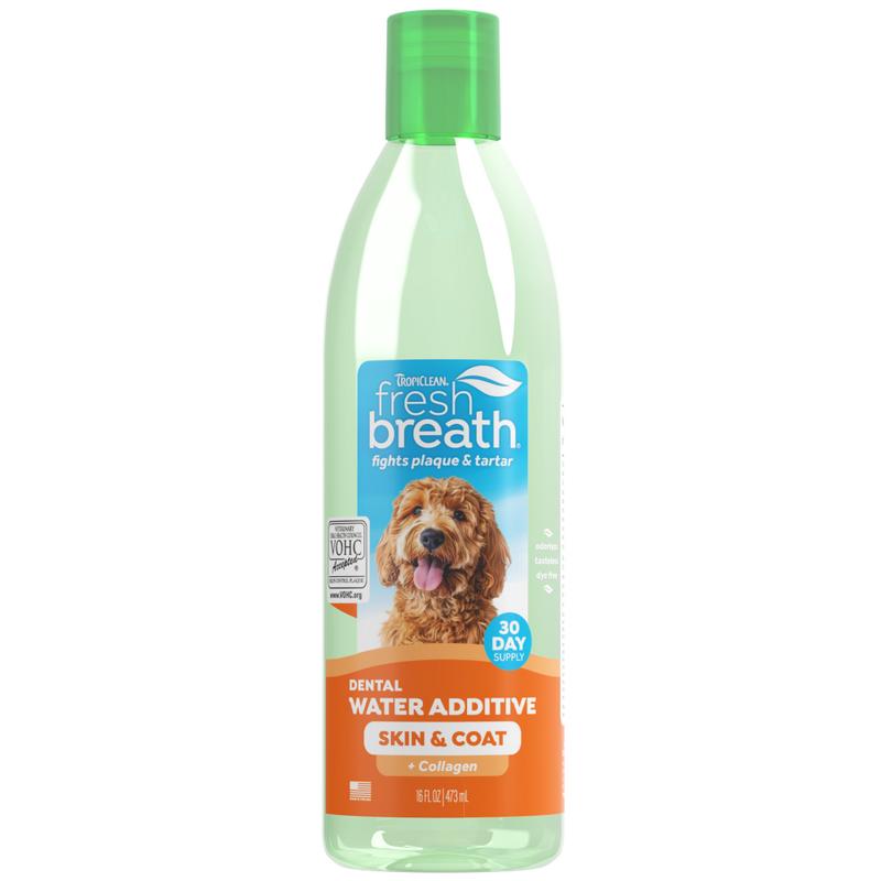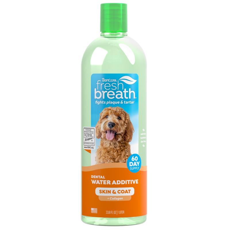 Promote your dog’s oral health and skin wellness with TropiClean Fresh Breath Oral Care Water Additive Plus Skin & Coat. This veterinarian-approved formula offers daily plaque and tartar defense while freshening breath for up to 12 hours — no brushing required. Enriched with collagen to help support healthy skin and a shiny coat, this tasteless dental water additive is easy to use—just add to your dog’s water bowl once a day. In as little as 14 days, it helps reduce plaque and tartar buildup, enhancing overall oral hygiene and preventing bad breath at its source.