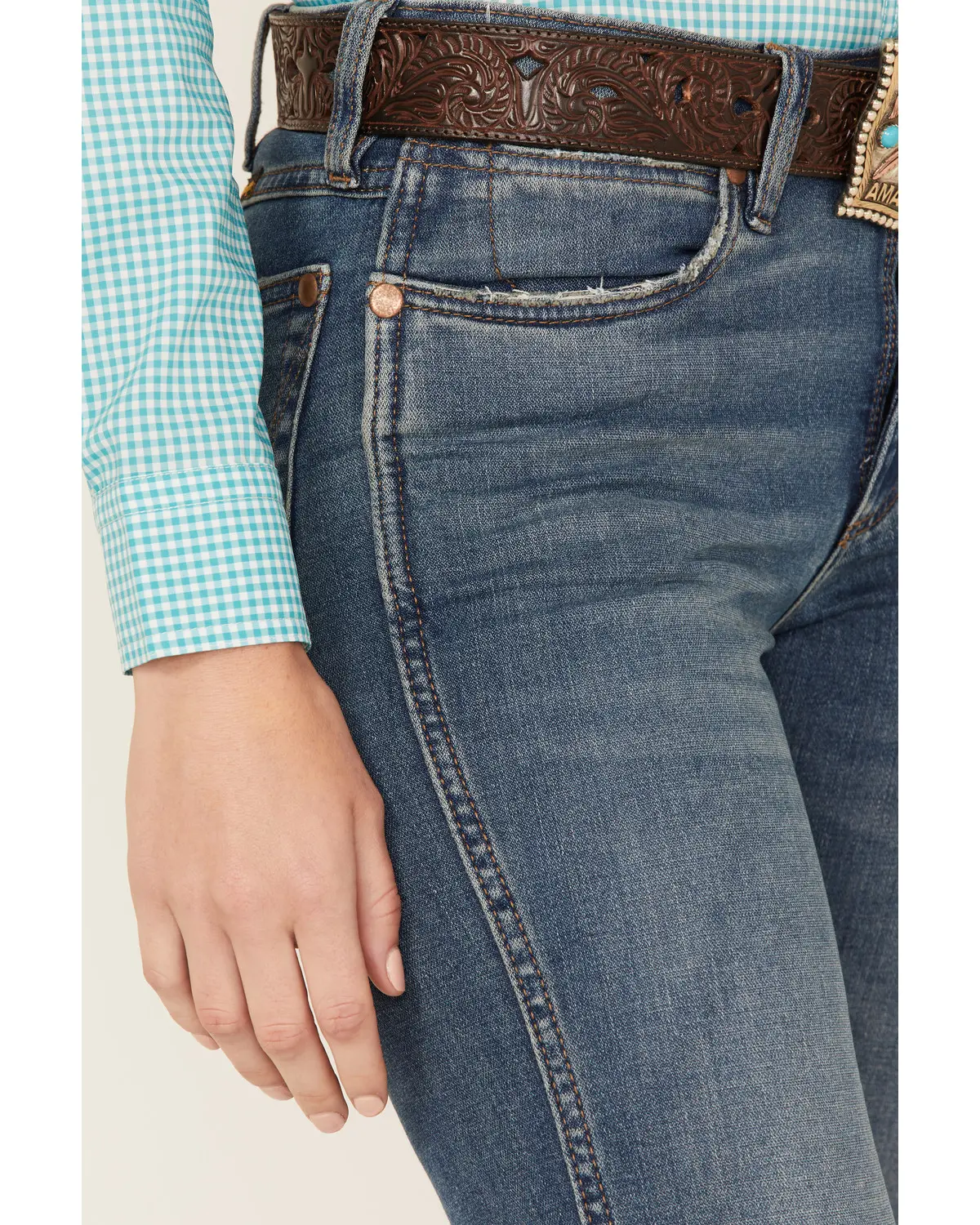 Button zip-fly. 5 Pocket styling. Vintage medium wash. Trouser leg. High rise. Machine washable.