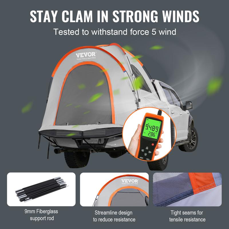 • Safer and Sturdier: The VEVOR pickup tent has a streamlined design that reduces wind resistance. It also has thickened 9mm fiberglass support poles that are corrosion-resistant and provide solid support. The sturdy tent can withstand force 5 wind, ensuring your safety even in windy weather.