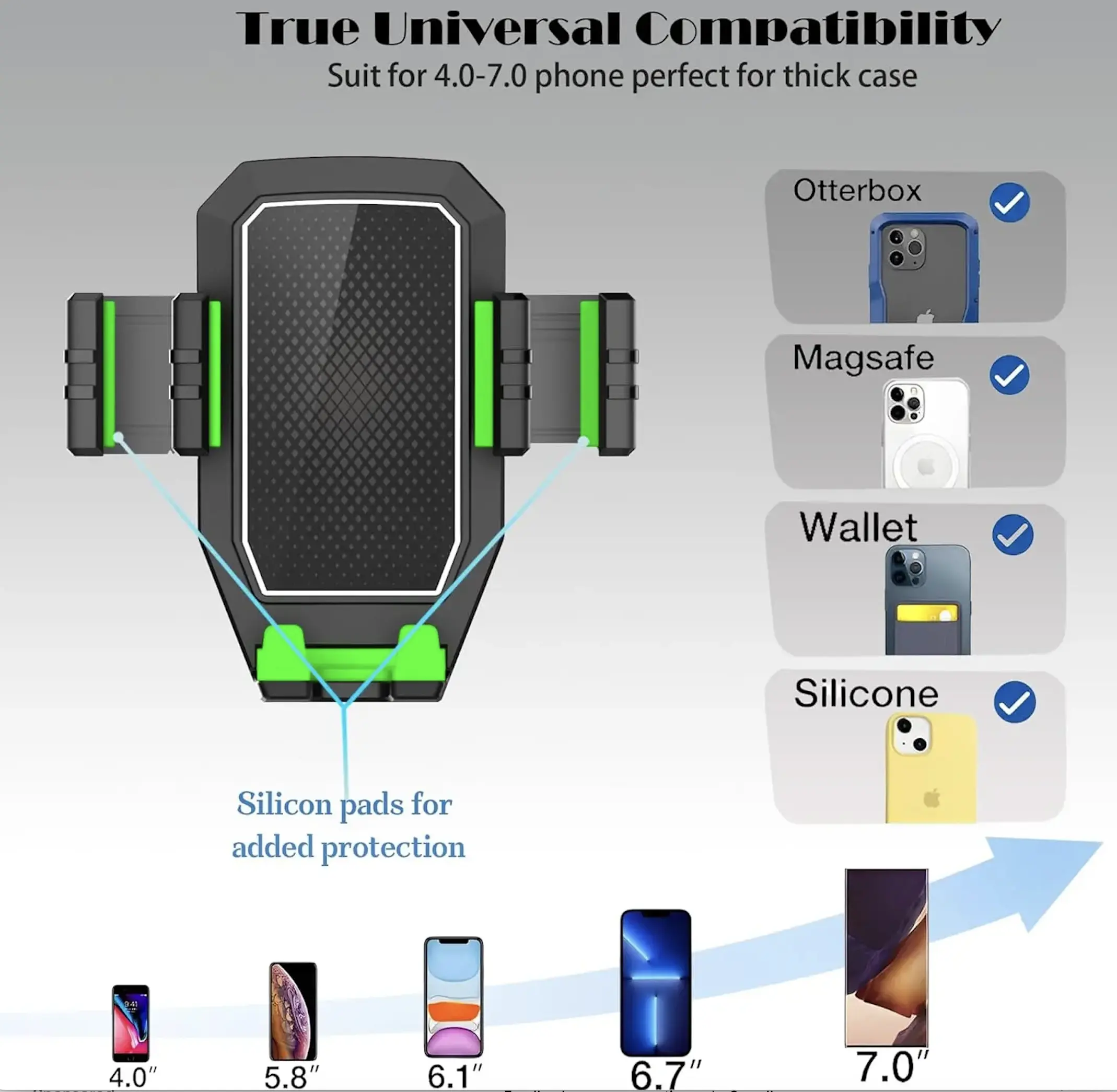 ·One-Hand Operation:This cell phone car mounts designing with a back release button, which is easy to clamp and release. It is padded with striped silicone to protect your phone from scratching or dropping off.It can open width is between 2.5 - 4.1 inches, suitable for most smartphones. Please note that the phone case must be thinner than 0.47 inches.