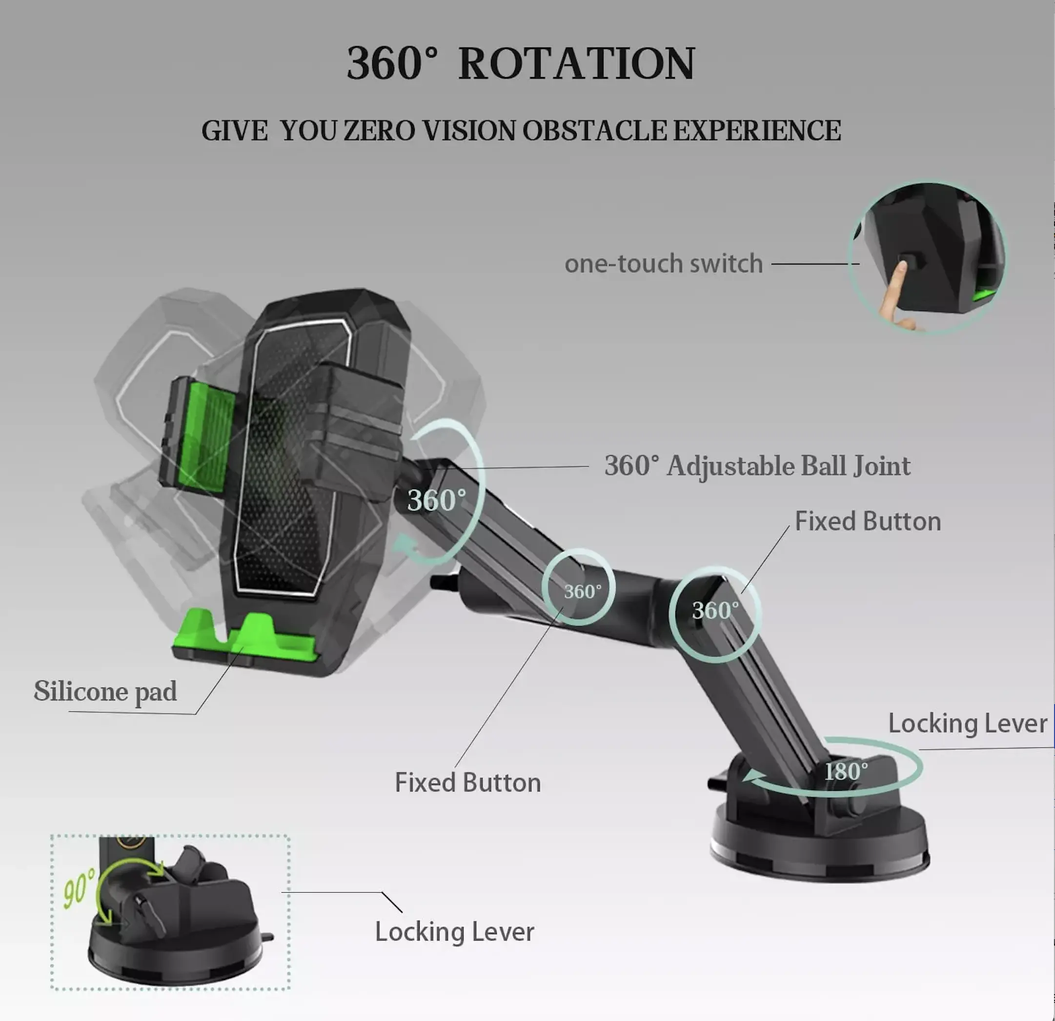 ·3-Point Long Arm And 360°View Angle:It also includes a 16.9 INCH LONG with 3-point arm, where each arm can be adjusted along with a fixed button for each, And all can be rotated 360° for optimal viewing angle. During driving, you can adjust this car cell phone holder to avoid obstructing the sight and ensure driving stability and safety.