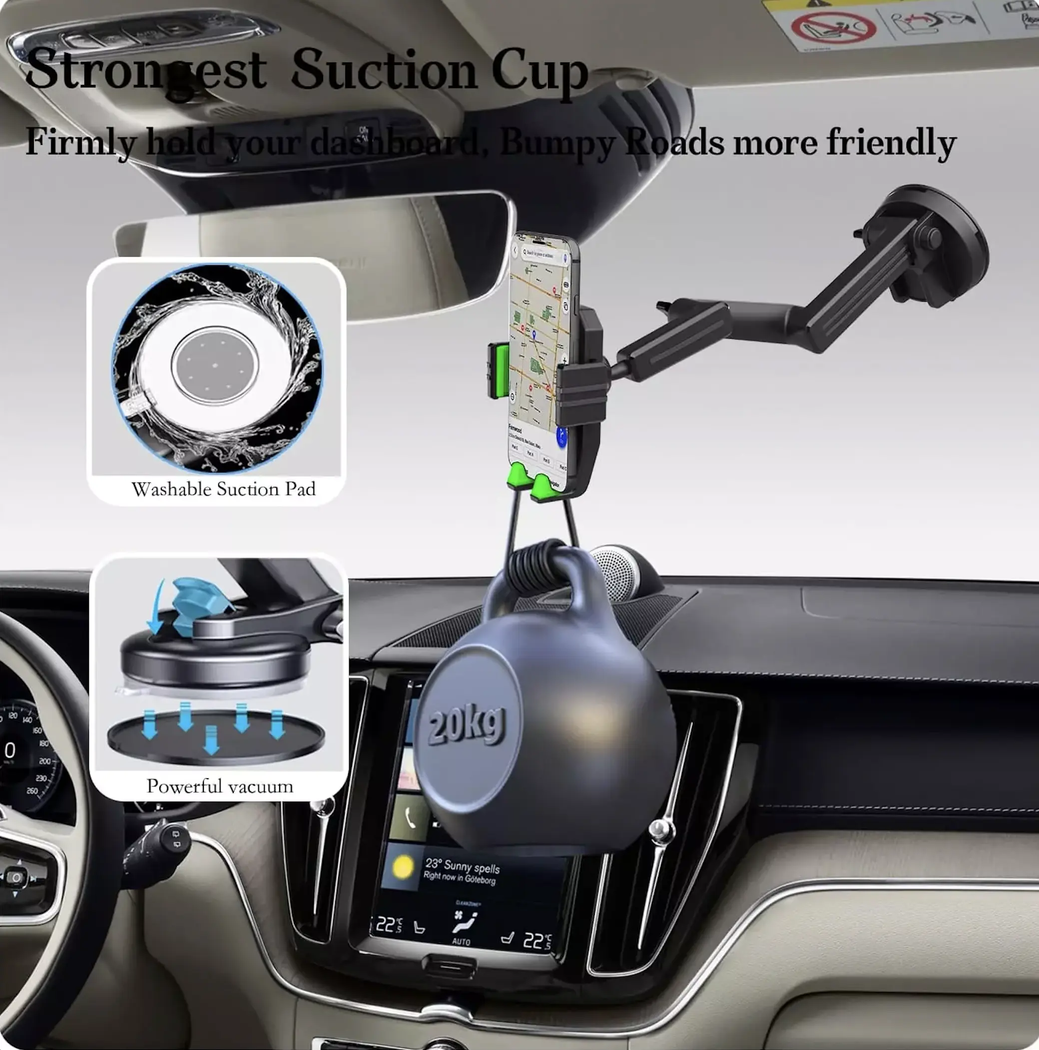 ·Strong Adhesive Suction:Equipped with strong sticky gel pad that provides strong suction on smooth surfaces without leaving any residue. It won't come off even when turning, bumping or driving at high speeds. Note: If the suction cup loses its grip, wash it with warm water, then air dry to restore its adsorption.