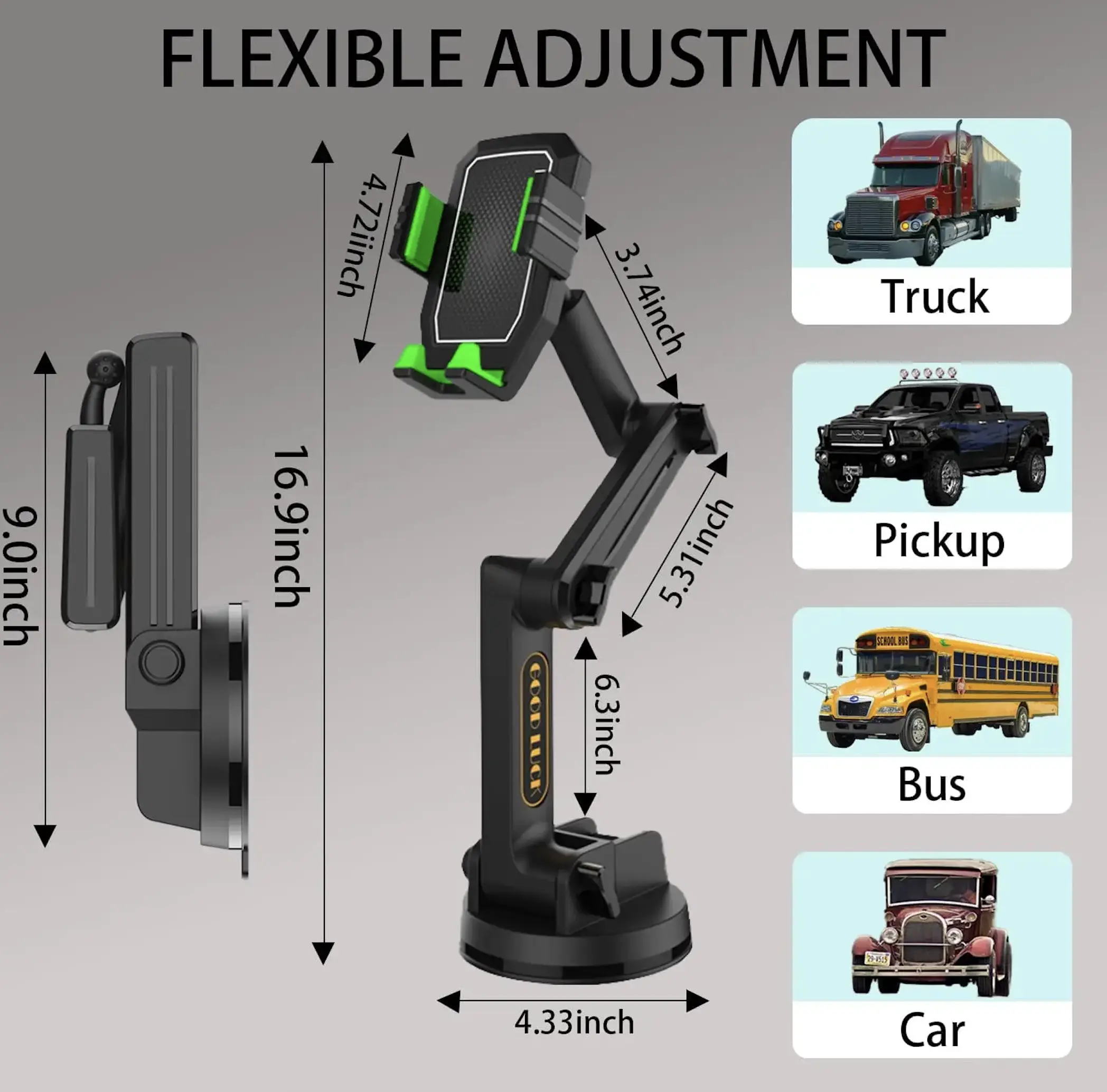 ·Especially Designed for Trucks:With 16.9 inches long arm, this truck phone mount can use on different surfaces of heavy-duty vehicles, such as bucket trucks, SUVs, Vans, Buses, and heavy-duty trucks, whether you need to use it on the windshield, the dashboard. hether you need to use it on the windshield, the dashboard.