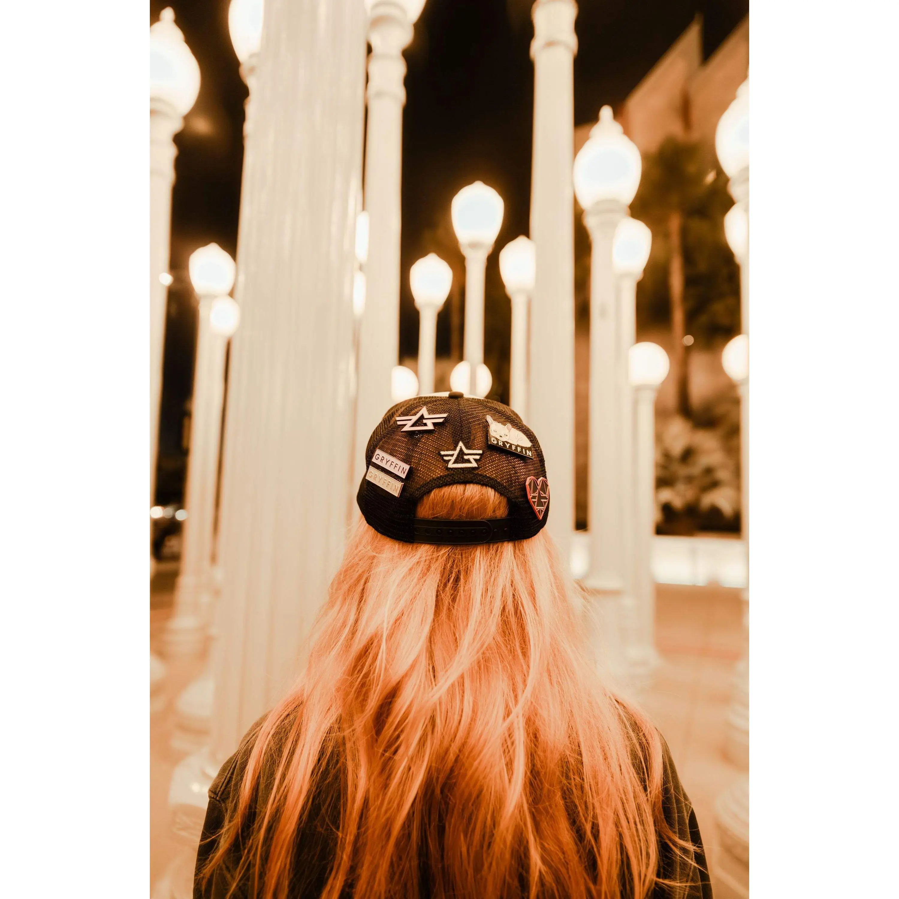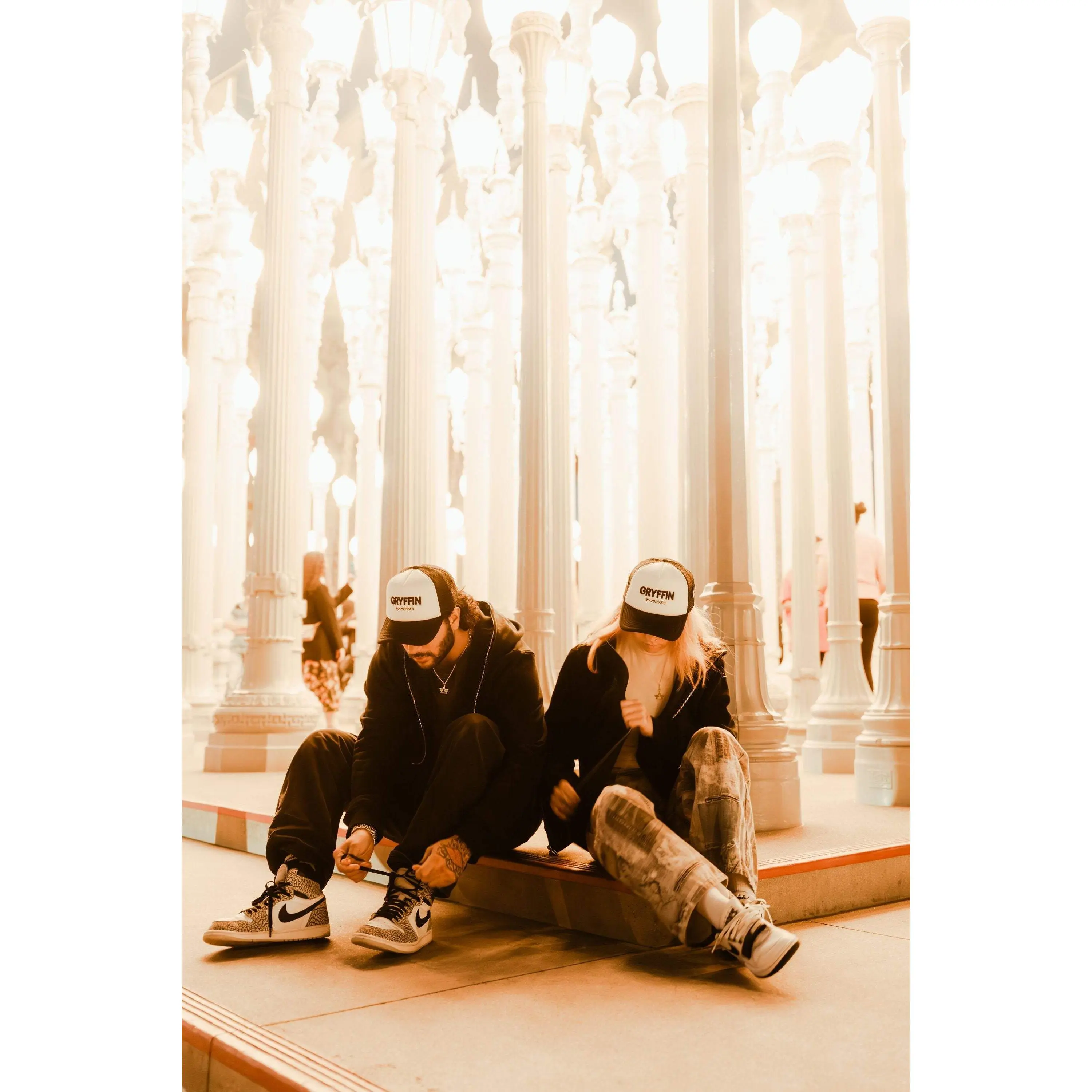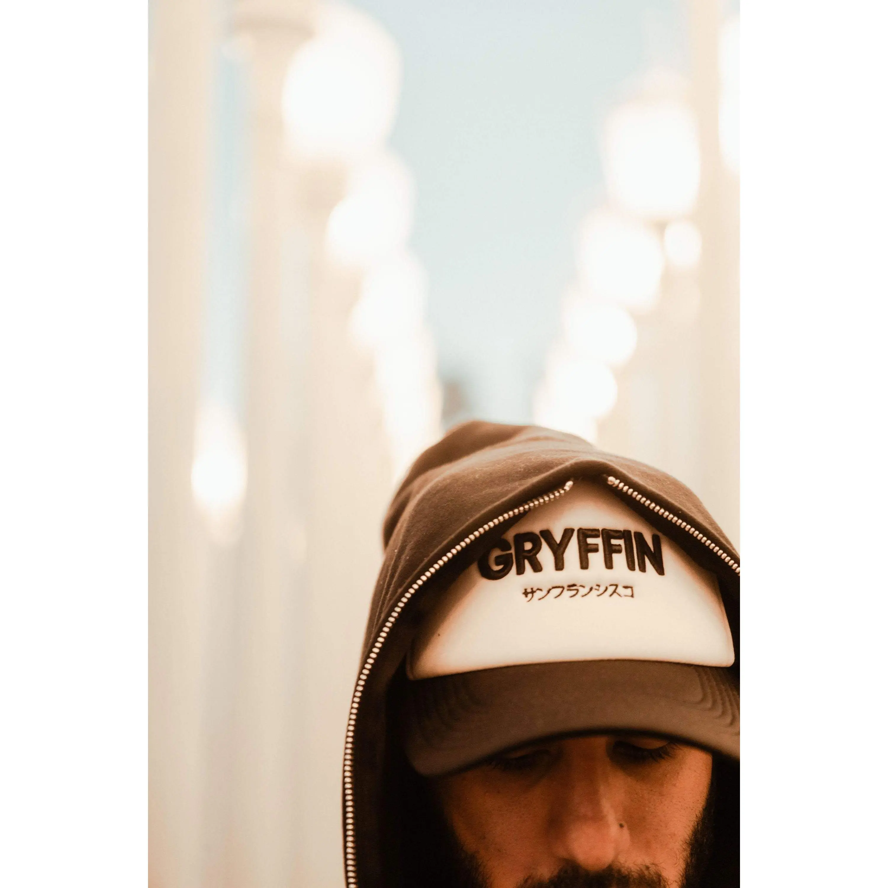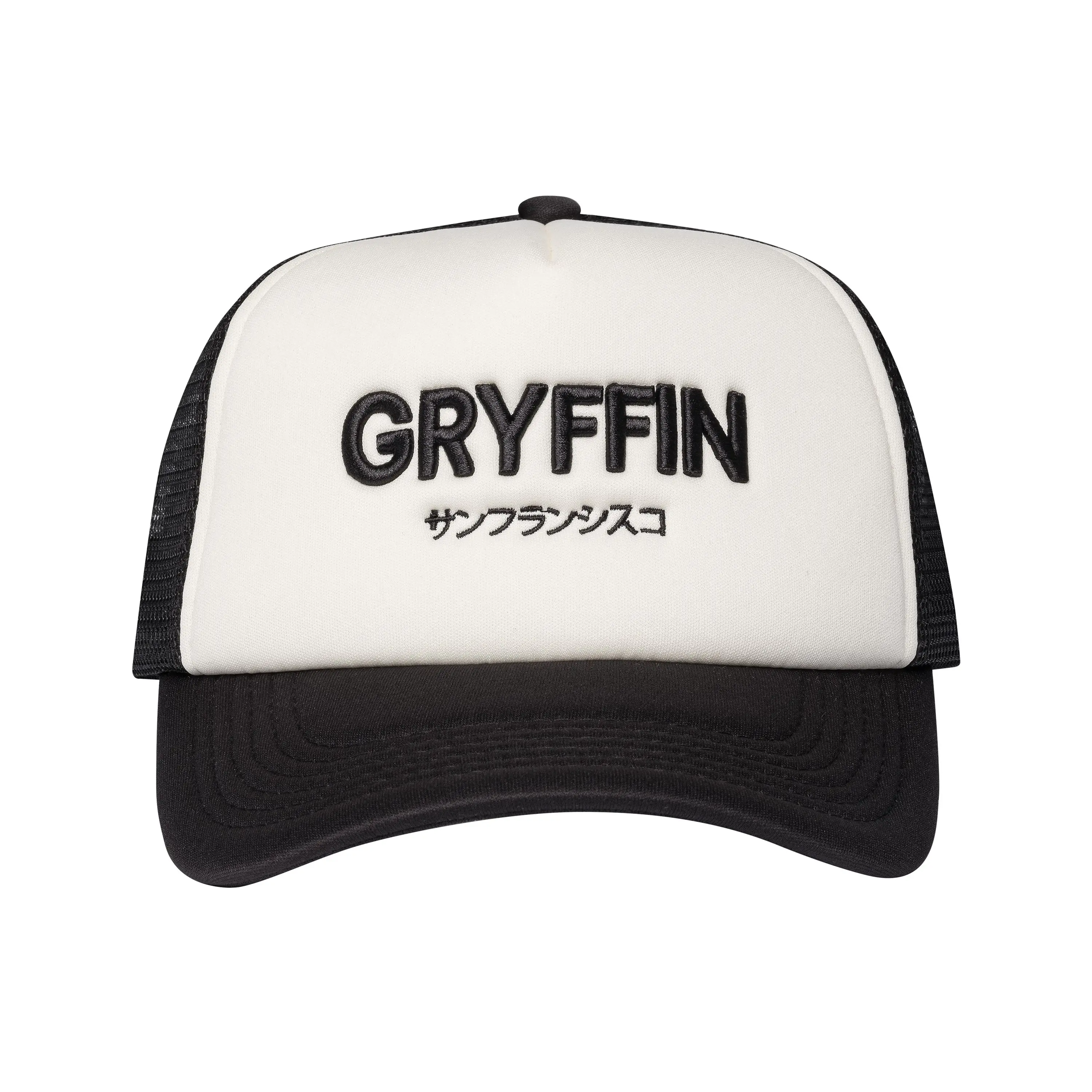 Beige and black trucker hat with Gryffin embroidered text, "Gryffin" in Katakana on the front and logo centered on the back.