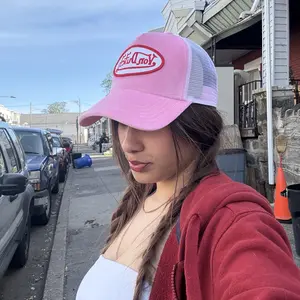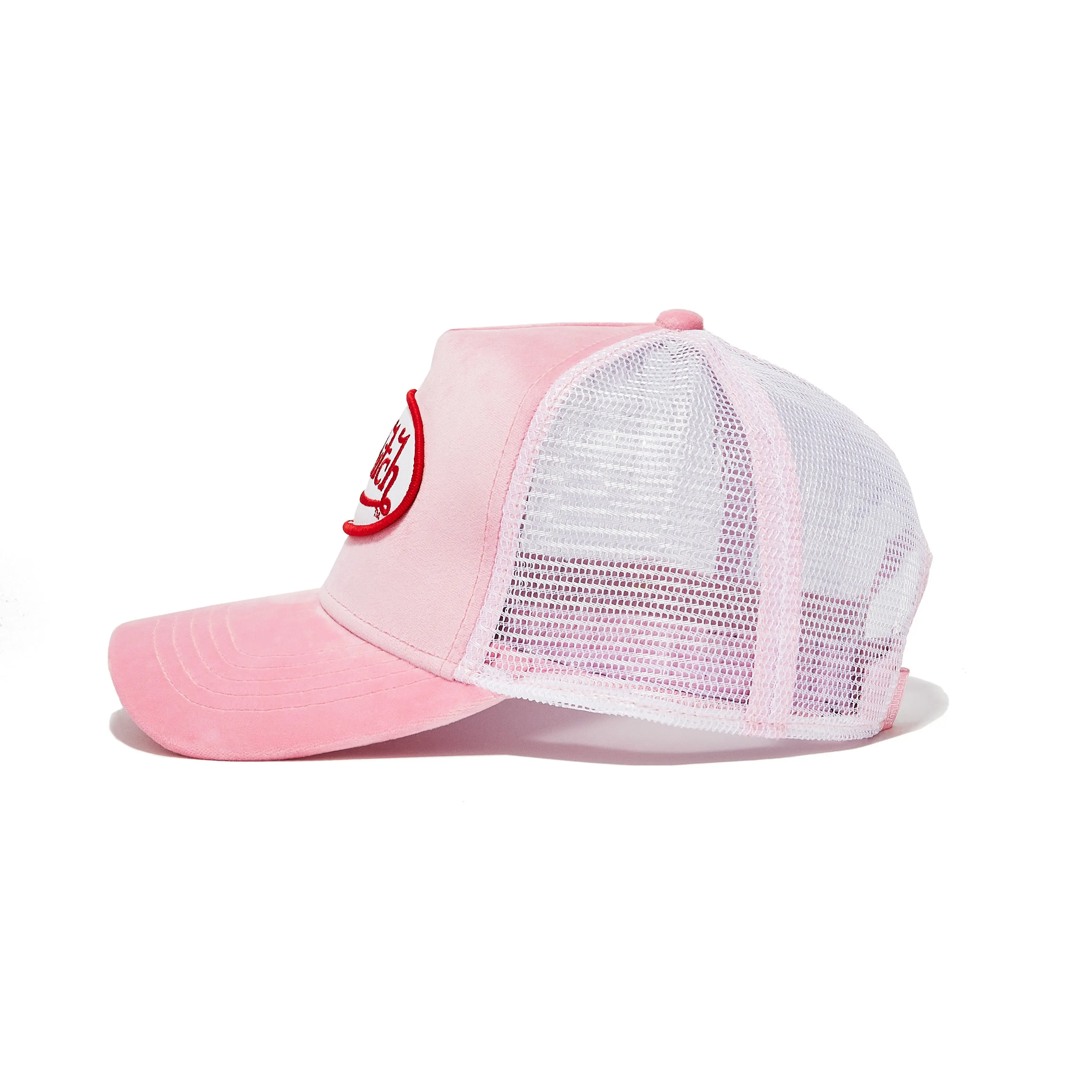 This Classic Snapback Trucker Hat by Von Dutch features pink velvet with the iconic logo patch on front, breathable mesh rear, and an adjustable snapback panel. All headwear sales are final.
