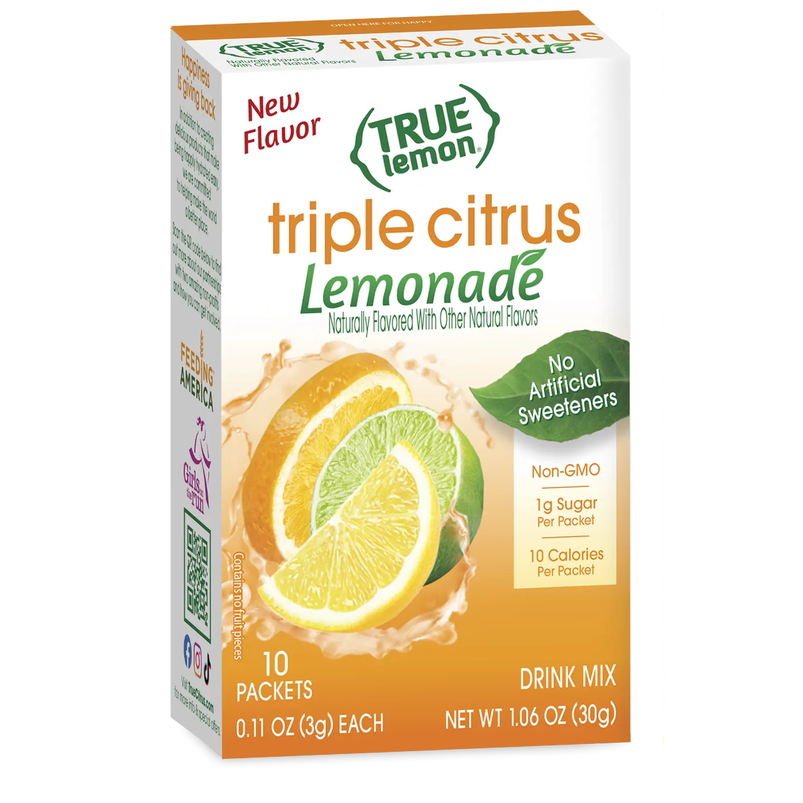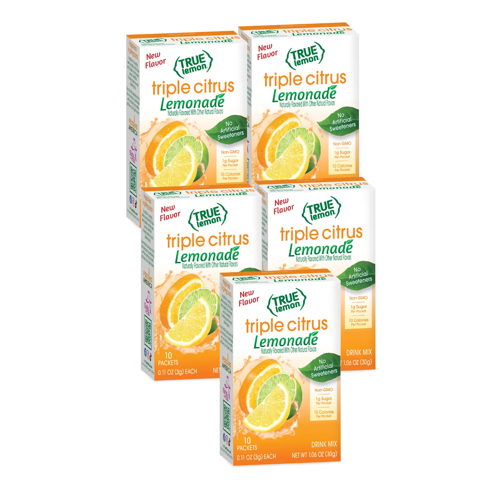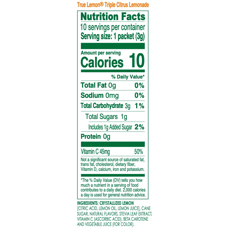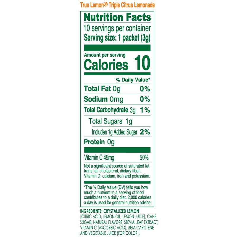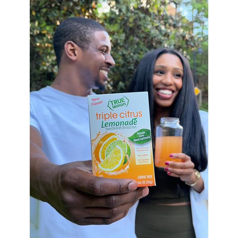 I have both the pure crystalized orange and crystalized lemon in the little flat packets. I use both of them to give my daily water a lift, and to sprinkle on my fish. I was excited to see a triple combination of lemon, orange and lime lemonade drink mix. There is no artificial powdery taste. It's very refreshing without any sourness, yet not overly sweet. It's very well balanced. I drink it iced. For clarification, True Lemon Triple Citrus Lemonade is a drink mix in the long packets, rather than juice crystals in the flat packets.