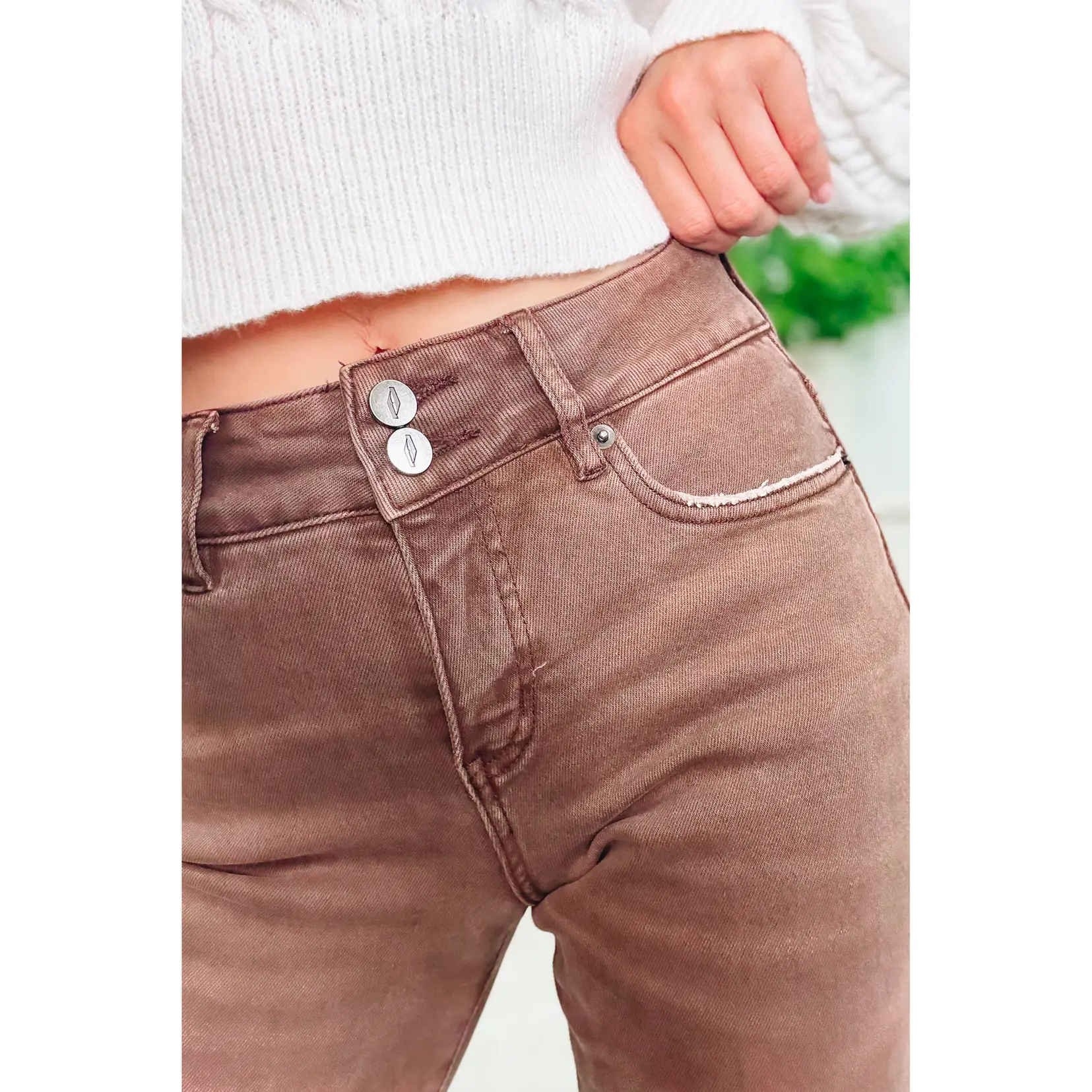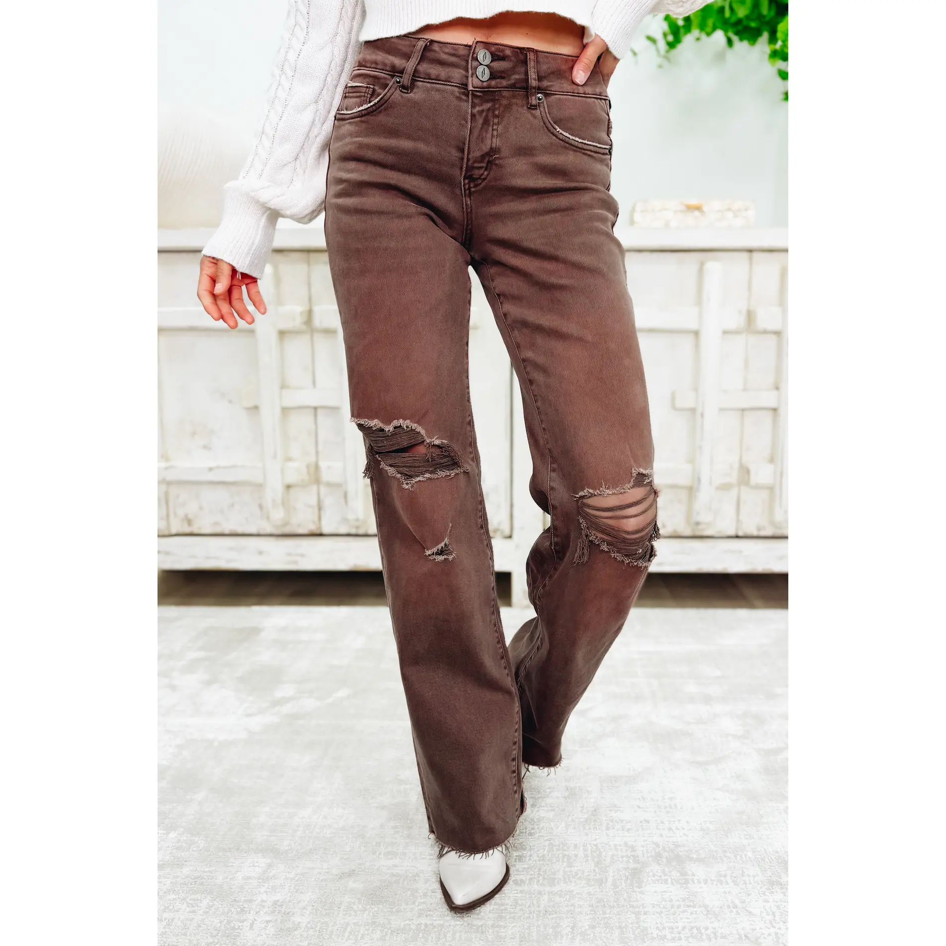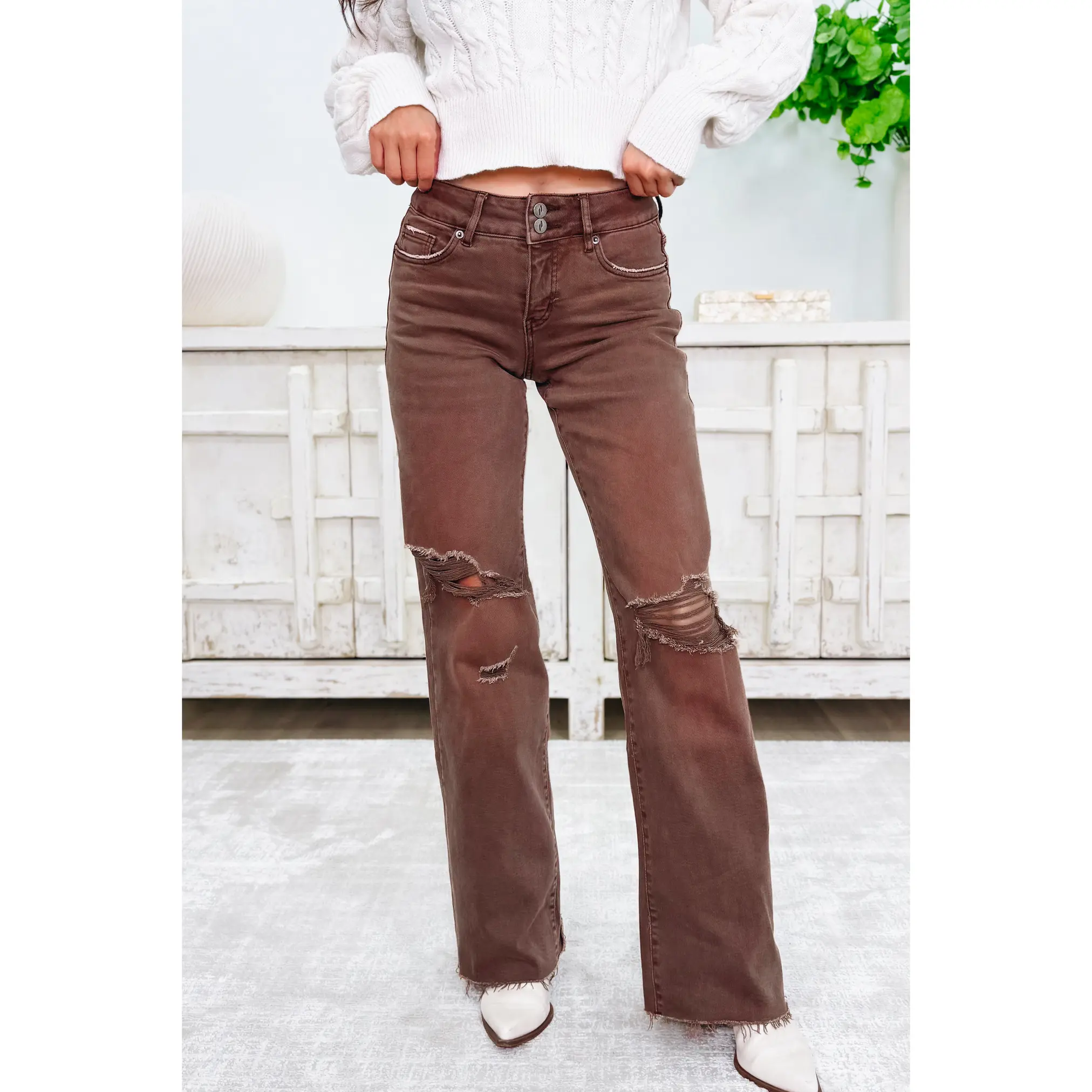 Step up your denim game with these amazing brown high-rise double button wide leg jeans by BAR Denim Label. Designed with built-in tummy control, they smooth and hold you in all the right places while keeping you comfy all day long. The rich brown wash paired with perfectly placed distressing makes them a total standoutâequal parts trendy and timeless. These wide-leg beauties are the fall dream jeans youâll live in, but trust us, theyâre perfect for every season. Chic, flattering, and insanely versatileâyour new go-to pair has arrived!