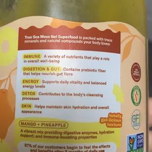 • Flavor: Sweet mango & tangy pineapple.• Ingredients: Purified water, sea moss, mango, pineapple, lime, monk fruit, ascorbic acid.