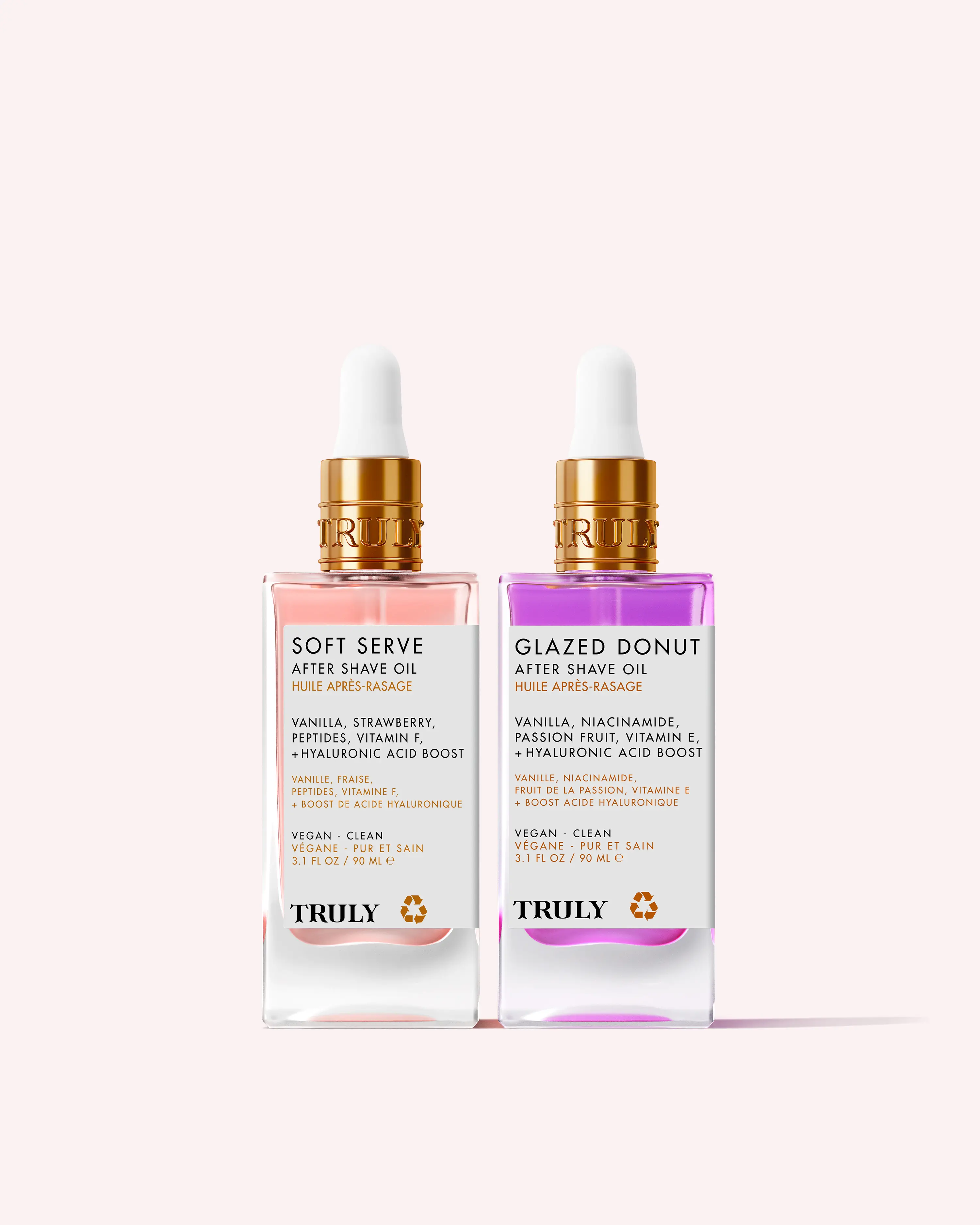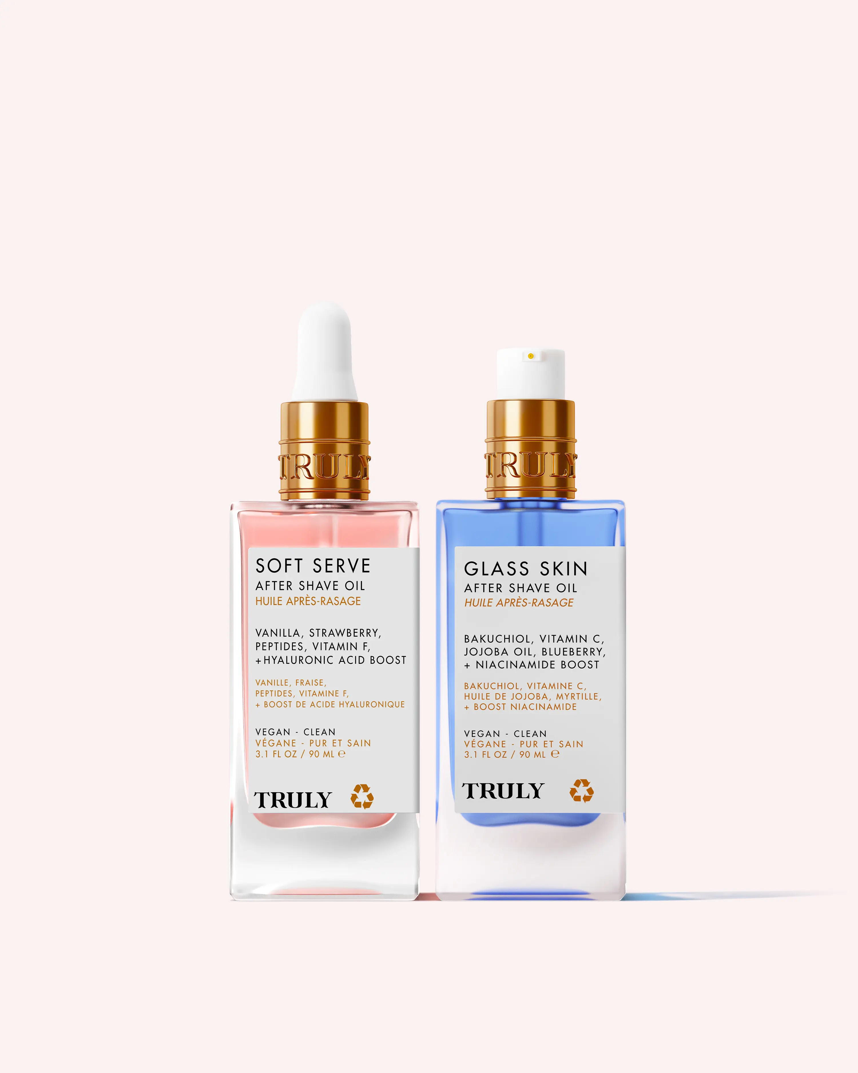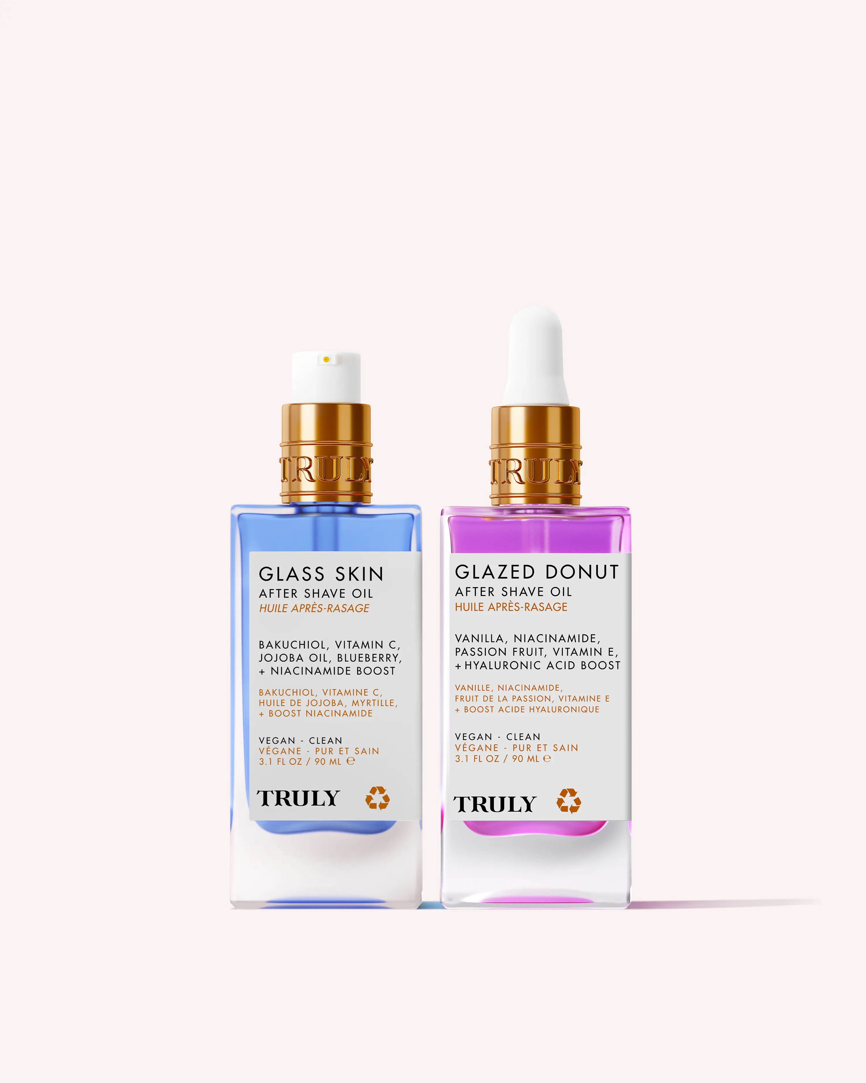 Introducing Truly’s top selling after shave oils, now in a mix and match set designed to target itchy skin, razor burn, ingrown hairs, and uneven skin tone. Whether you want instant glow, deep hydration, or silky smooth skin, this customizable set delivers radiant results with supercharged, skin-loving ingredients such as hyaluronic acid, niacinamide, vitamin C, bakuchiol, and peptides.