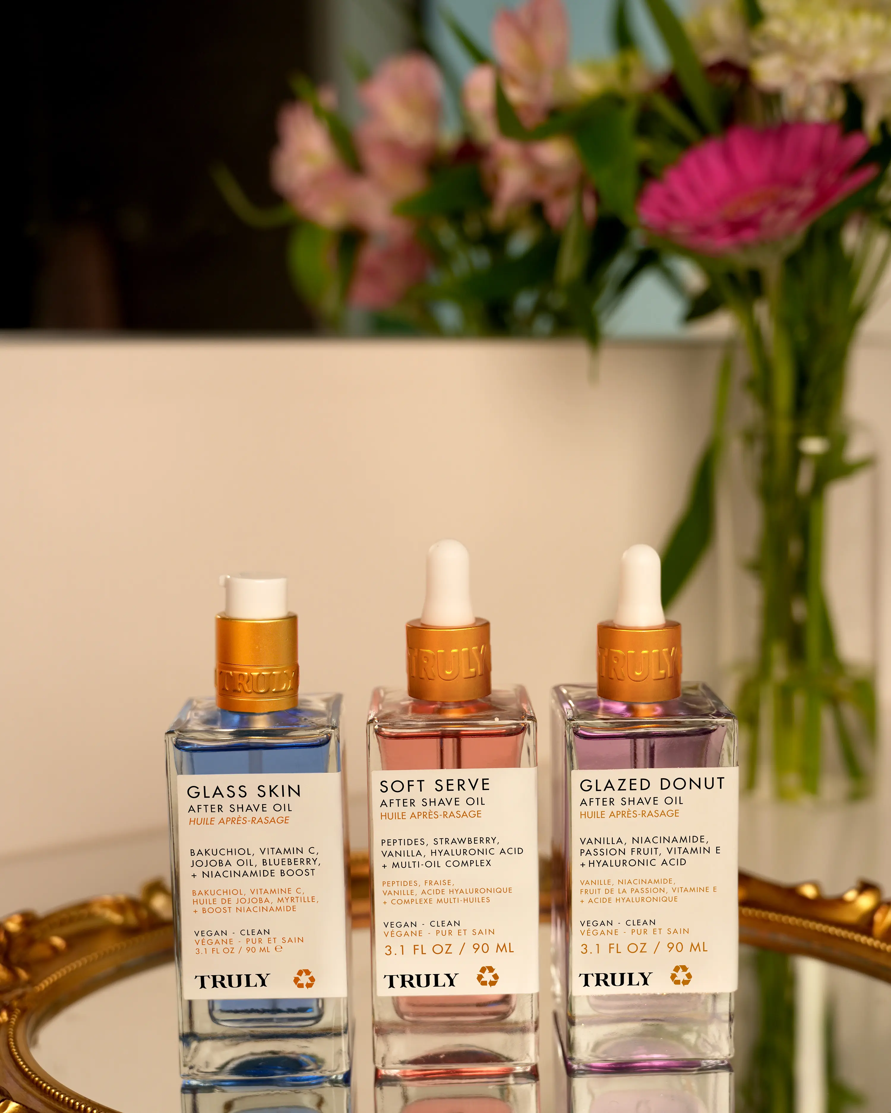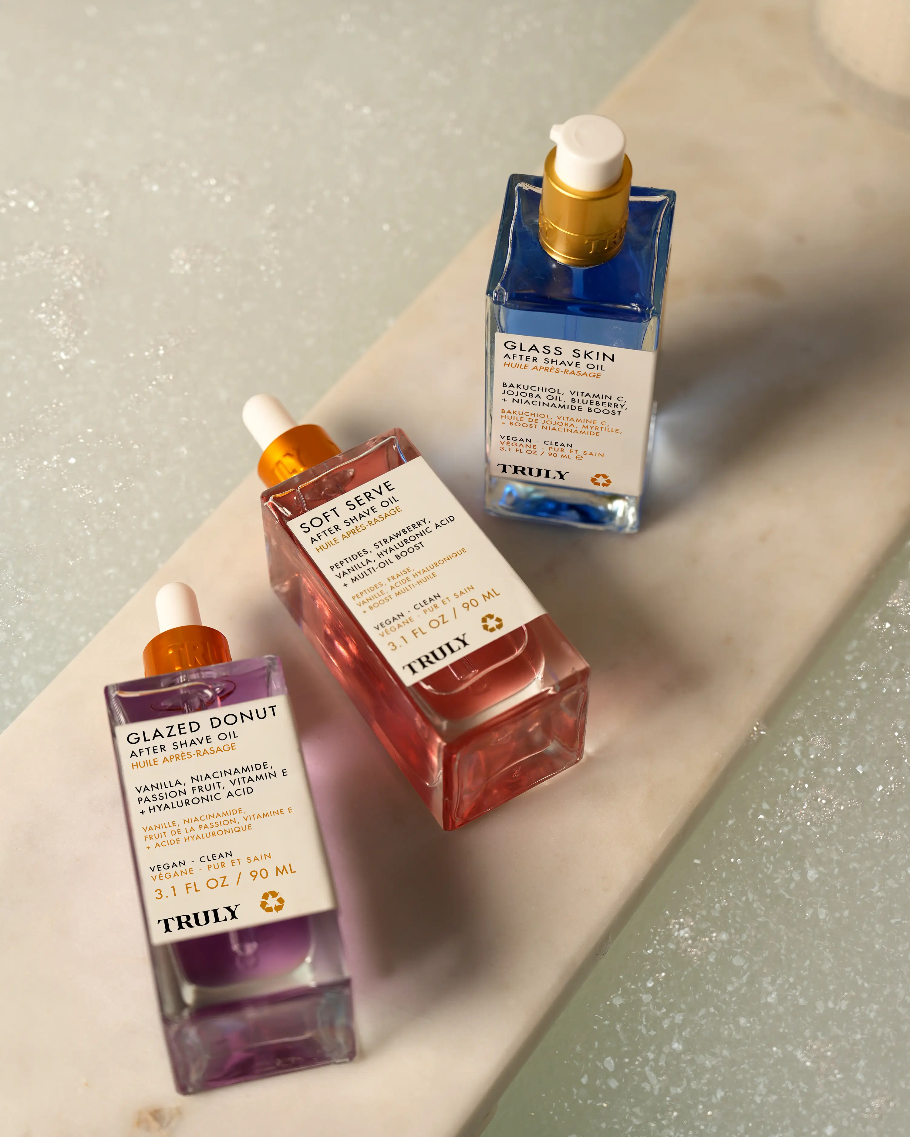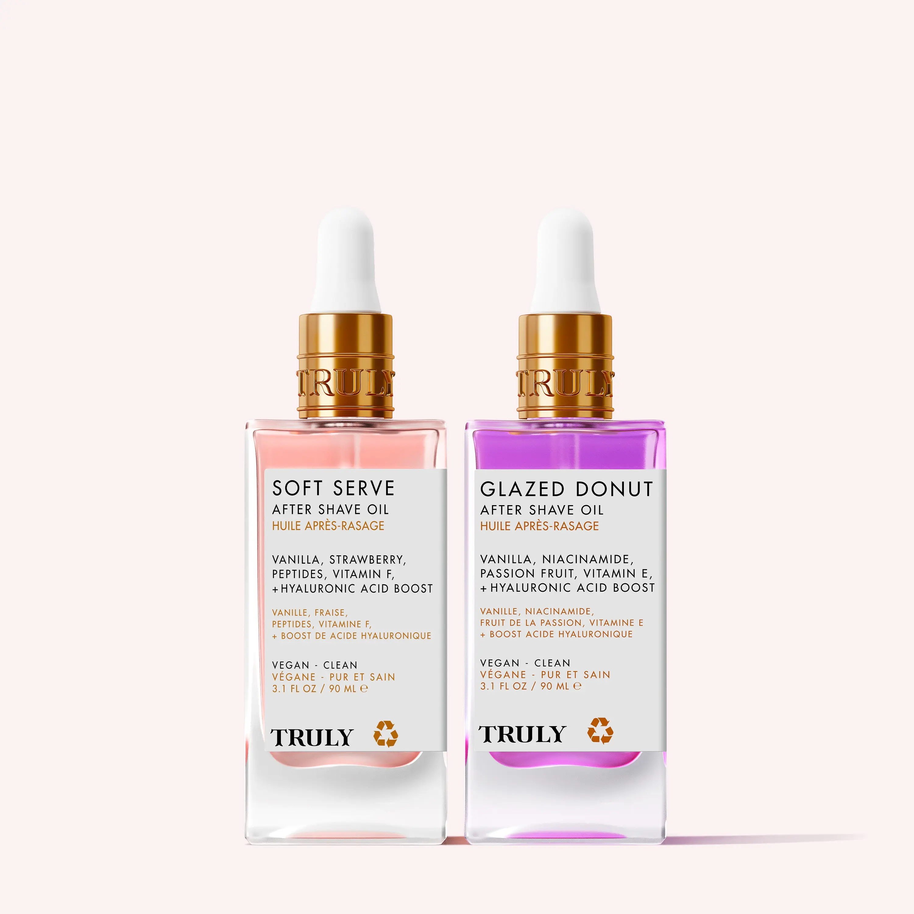Introducing Truly’s top selling after shave oils, now in a mix and match set designed to target itchy skin, razor burn, ingrown hairs, and uneven skin tone. Whether you want instant glow, deep hydration, or silky smooth skin, this customizable set delivers radiant results with supercharged, skin-loving ingredients such as hyaluronic acid, niacinamide, vitamin C, bakuchiol, and peptides.