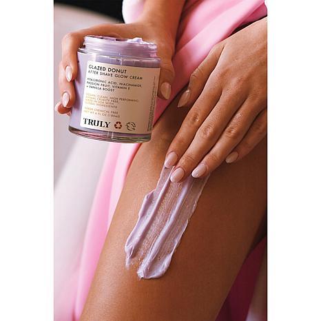 Truly Beauty Jumbo Size Glazed Donut After-Shave Body Cream What It Is Indulge in this luxe, lightweight body moisturizer that nourishes your skin with dewy hydration and leaves behind a tantalizing fragrance of sweet vanilla glaze, buttercream and toasted marshmallow. Formulated with niacinamide, hyaluronic acid and other key ingredients, it leaves skin looking gorgeously smooth and glowy, with continued use.  What You Get 12 fl. oz. Glazed Donut After-Shave Body Cream What It Does A luxe, lightweight body cream that is ideal for use after shaving Helps provide more plump, bouncy and glowy-looking skin, with continued use Contains moisturizers that help diminish the look of fine lines and wrinkles and plumps the look of skin with continued use Contains niacinamide, which has been known to help temporarily brighten the look of skin and improve the look of the skin complexion A decadent body cream with a sweet vanilla buttercream scent that is boosted with niacinamide, hyaluronic acid, vanilla fruit extract and passionfruit for gorgeously smooth and glowing-looking skin, with continued use