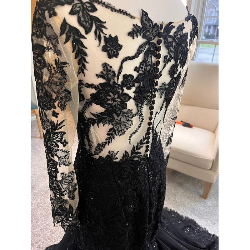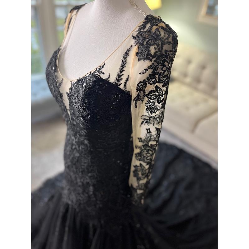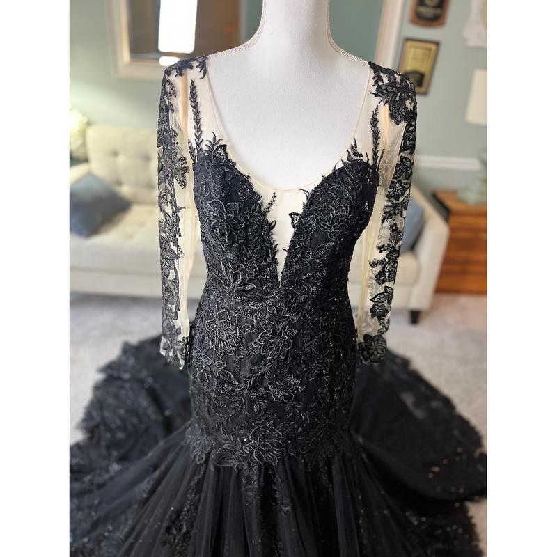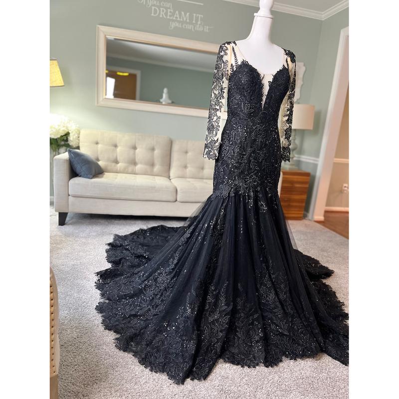 Fallon Black Trumpet Wedding Dress with long fitted illusion sleeves, Gothic Wedding Dress, Trumpet Black Wedding Dress