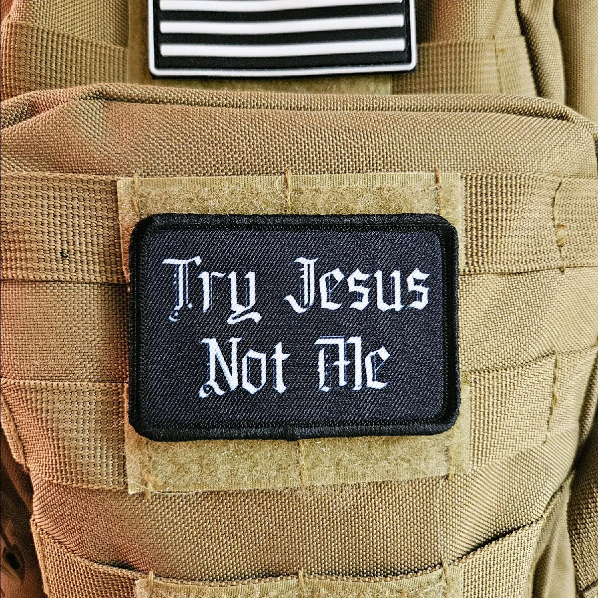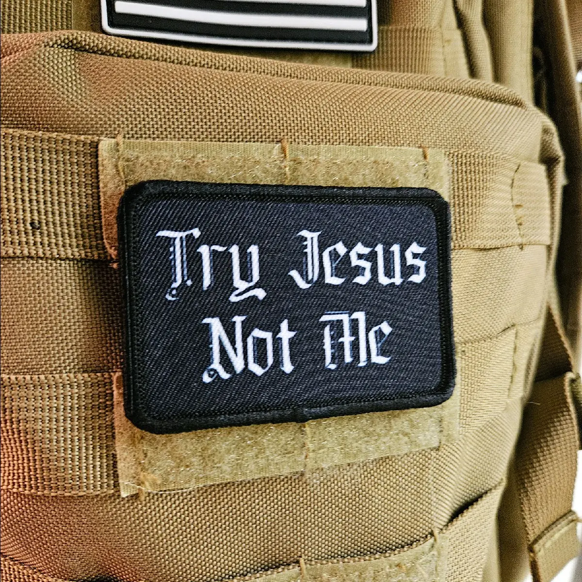 Try Jesus not me meme 2"x3" removable morale patch with hook and loop backing