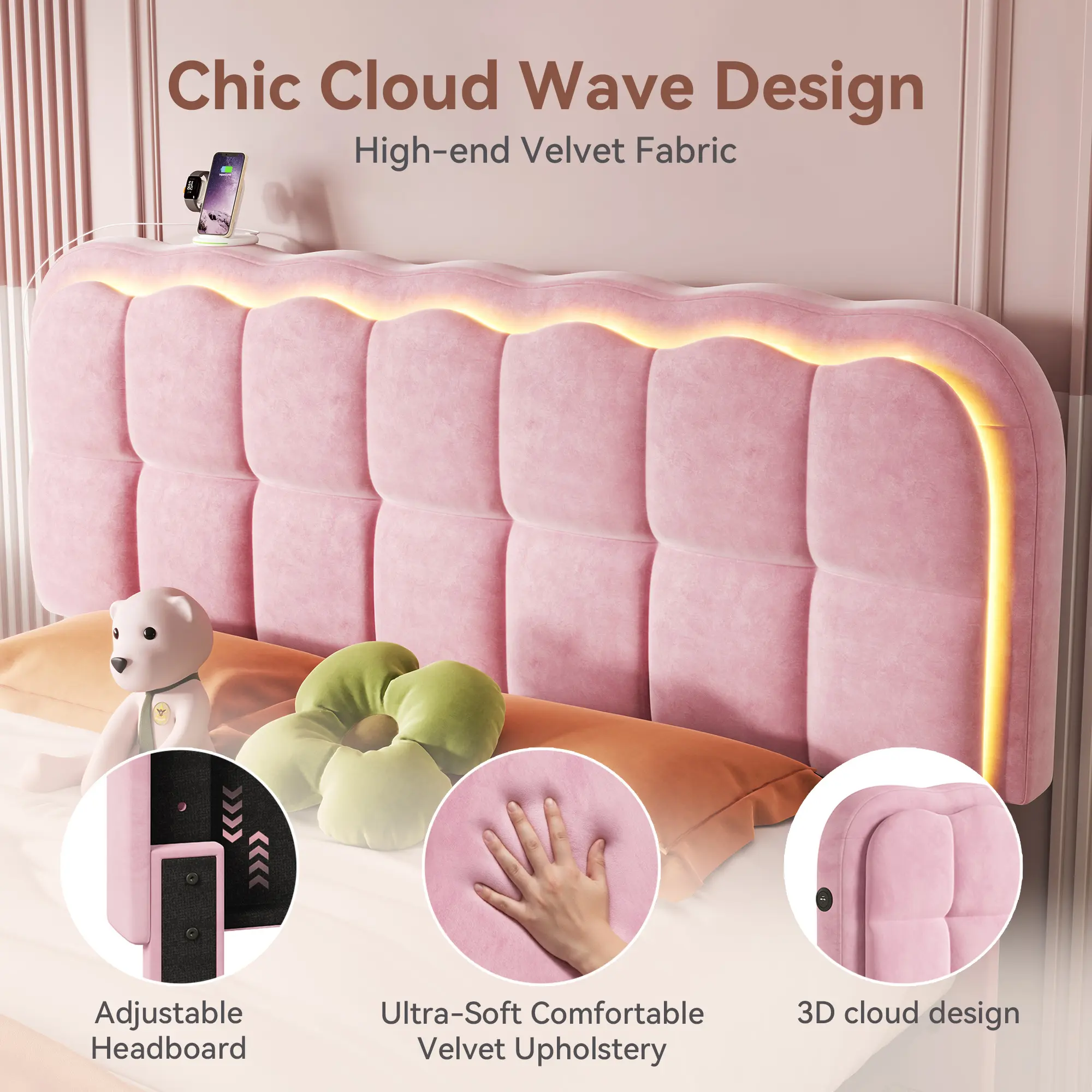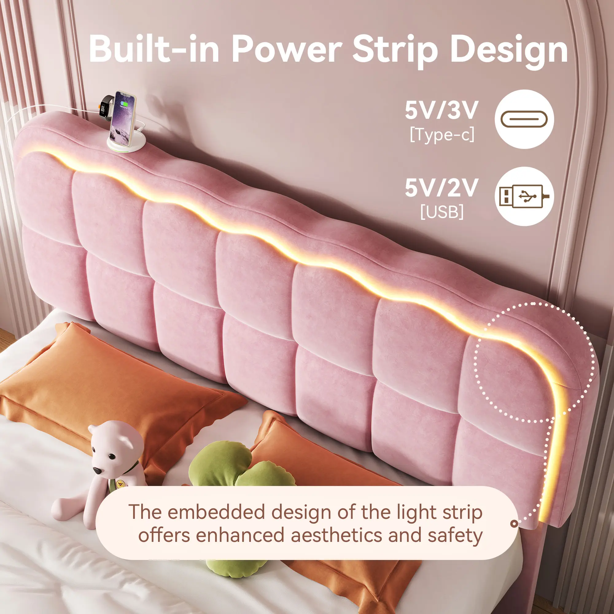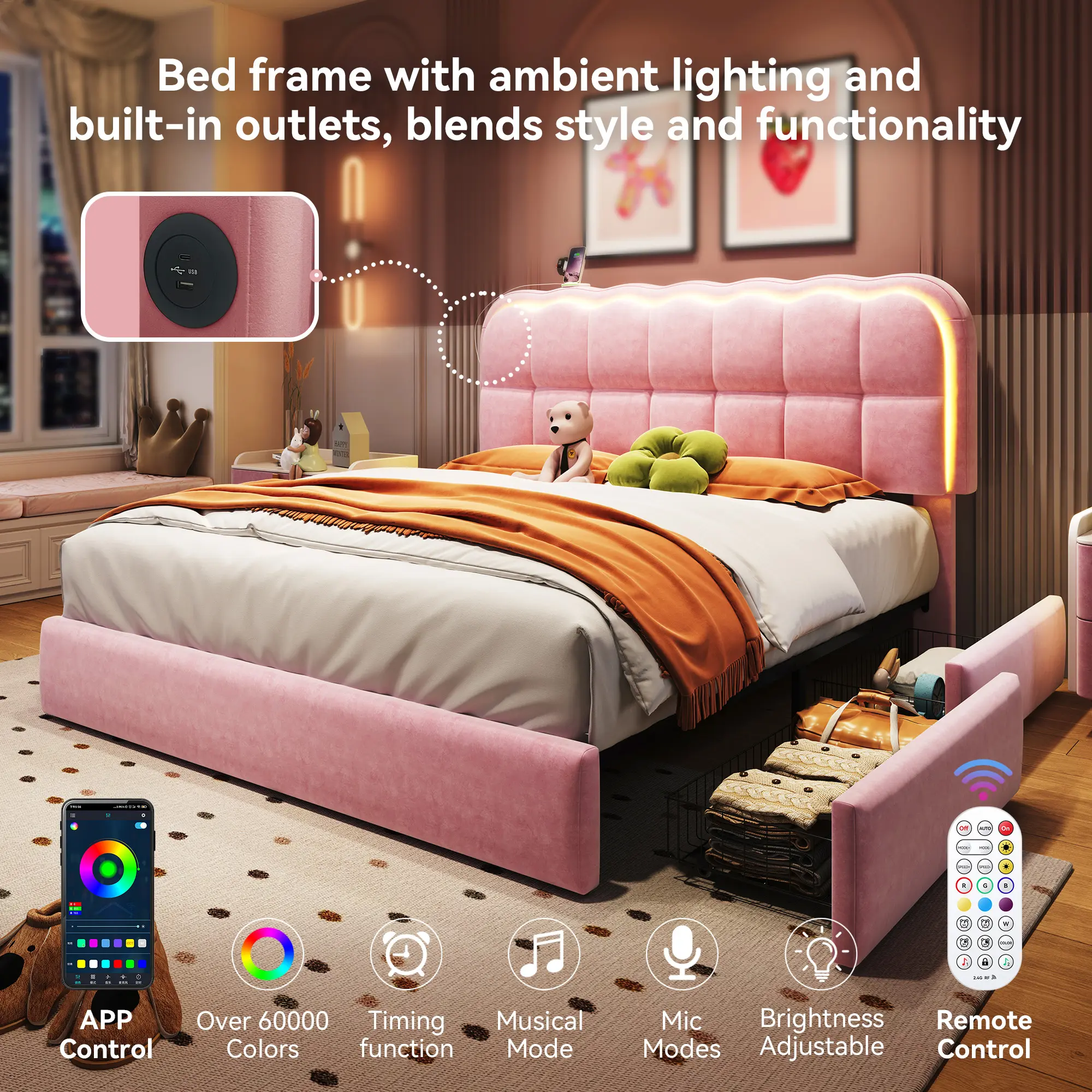 ·App-controlled adjustable headboard lighting.