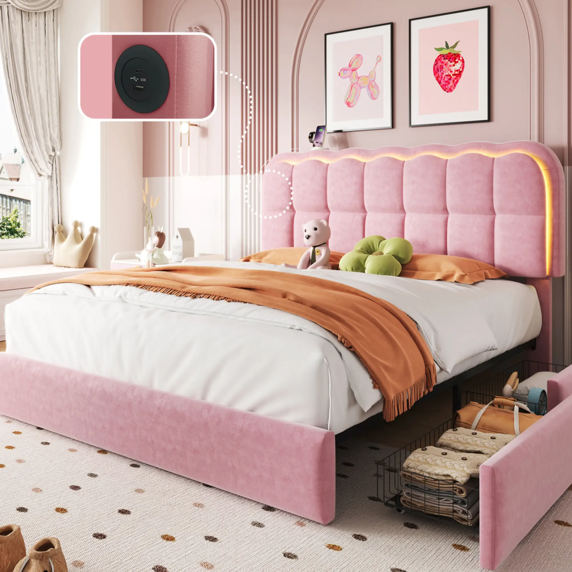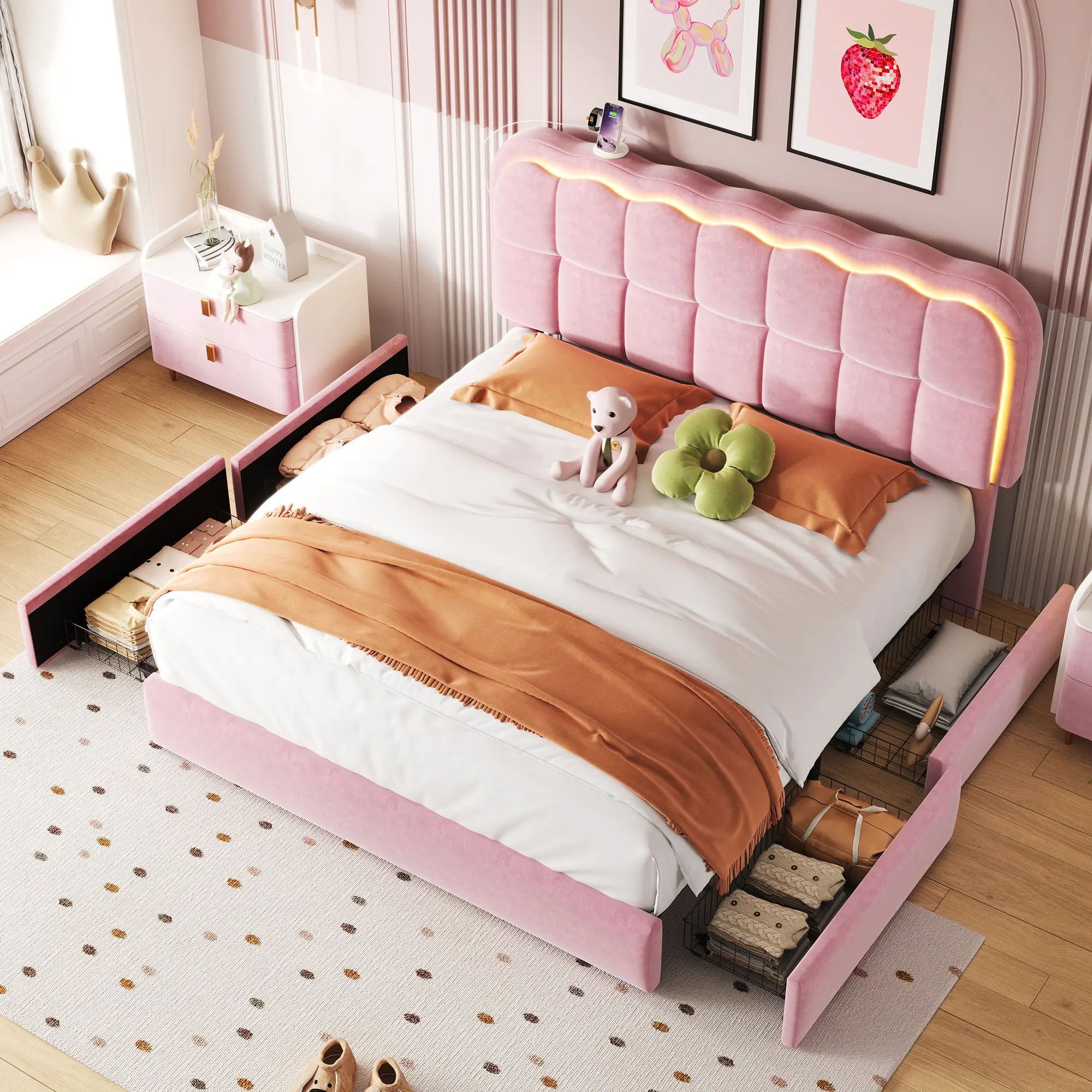 With its storage drawers and USB charging station, this bed frame is both versatile and convenient. Ideal for those looking for a modern bed with practical features. This bed frame combines style with functionality, making it a great choice.