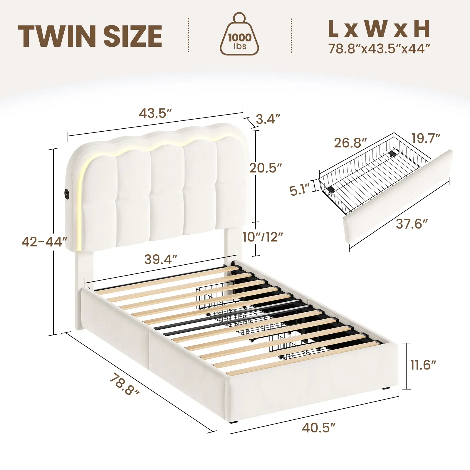 Equipped with app-controlled adjustable headboard lighting, this bed offers customizable lighting. Adjust the light to your preference without guessing. This feature ensures a personalized lighting experience, enhancing your comfort and convenience.