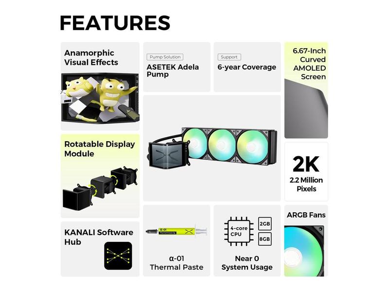 TRYX PANORAMA SE 360 ARGB is a premium 360mm all-in-one liquid cooler featuring a rotatable 6.67" AMOLED curved screen with 2K resolution, 500 nits brightness, and a 60Hz refresh rate. It delivers immersive visuals with 372 PPI pixel density and 1, 000, 000:1 contrast. The screen supports 3D anamorphic effects and custom animations, managed via the TRYX KANALI software for personalized content, system info, and split-screen functionality. Powered by ASETEKs Adela cooling technology, it provides up to 280W TDP, ideal for gaming and intensive workloads. Equipped with three quiet ARGB fans, it offers compatibility with Intel and AMD platforms, ensuring efficient, stable, and silent operation.