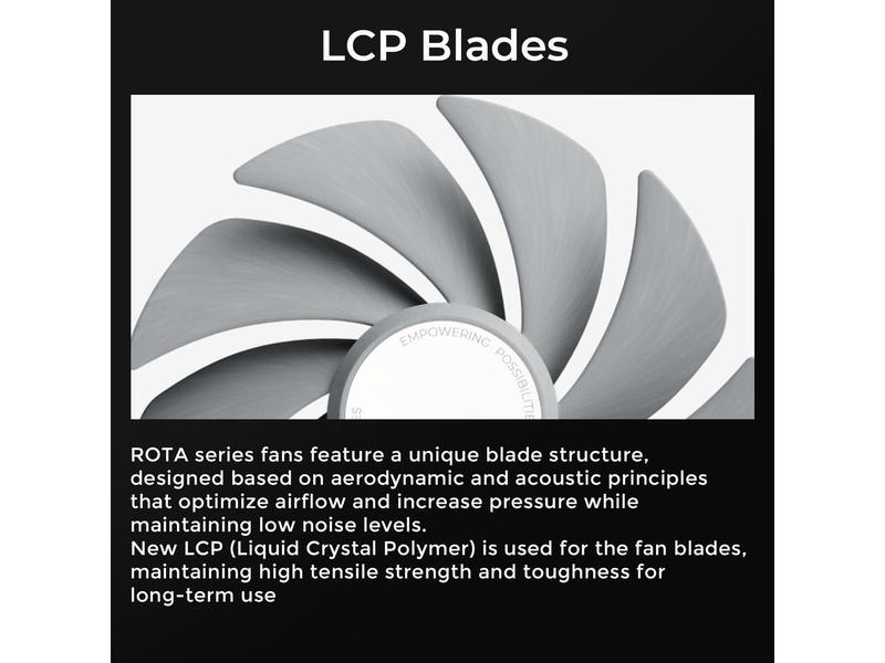 Crafted from advanced LCP (Liquid Crystal Polymer) material, the fan blades are both lightweight and robust, contributing to a longer lifespan and consistent performance. The Fluid Dynamic Bearing (FDB) technology further enhances durability and reduces operational noise, making it one of the quietest fans in its class.