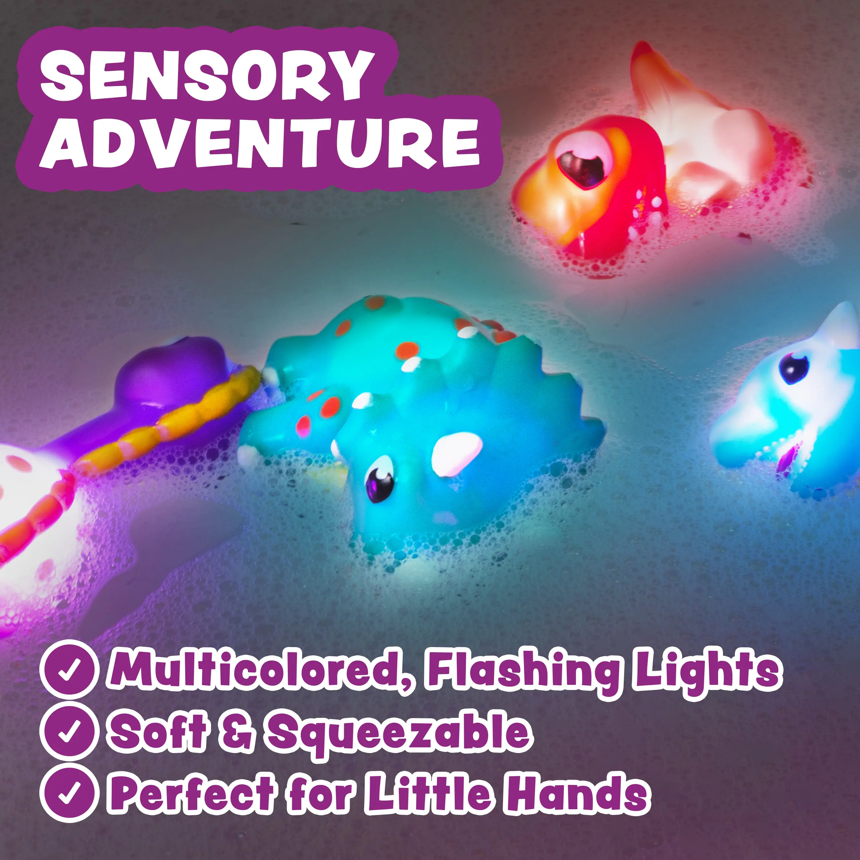 ·SENSORY PLAY: Light up toys add a sensory boost to any toddler bath! Dinosaurs for kids light-up, flashing multicolored sensory lights when they touch water—a sensory escape with bath lights for kids!
