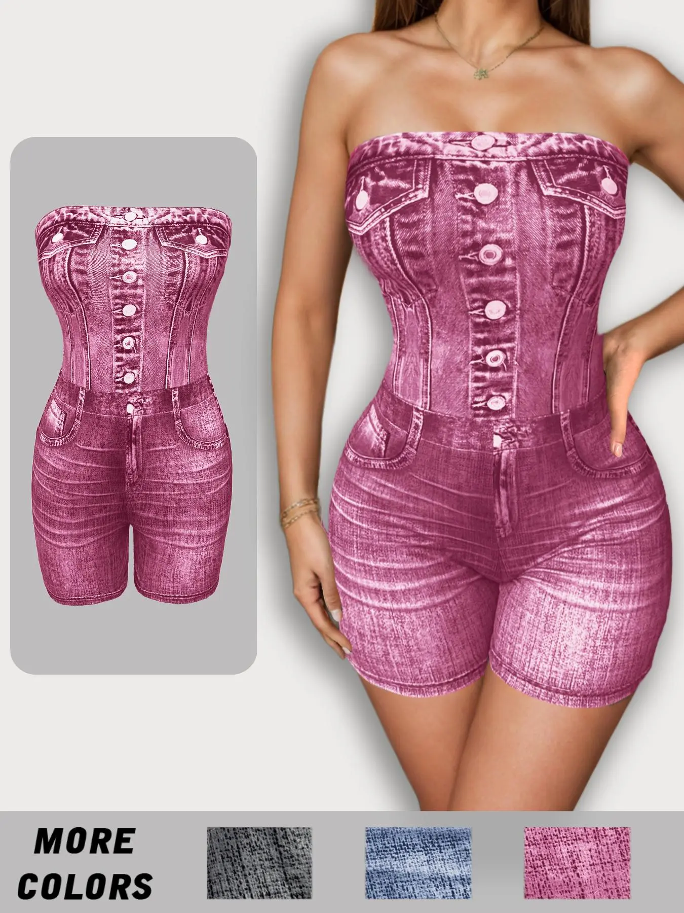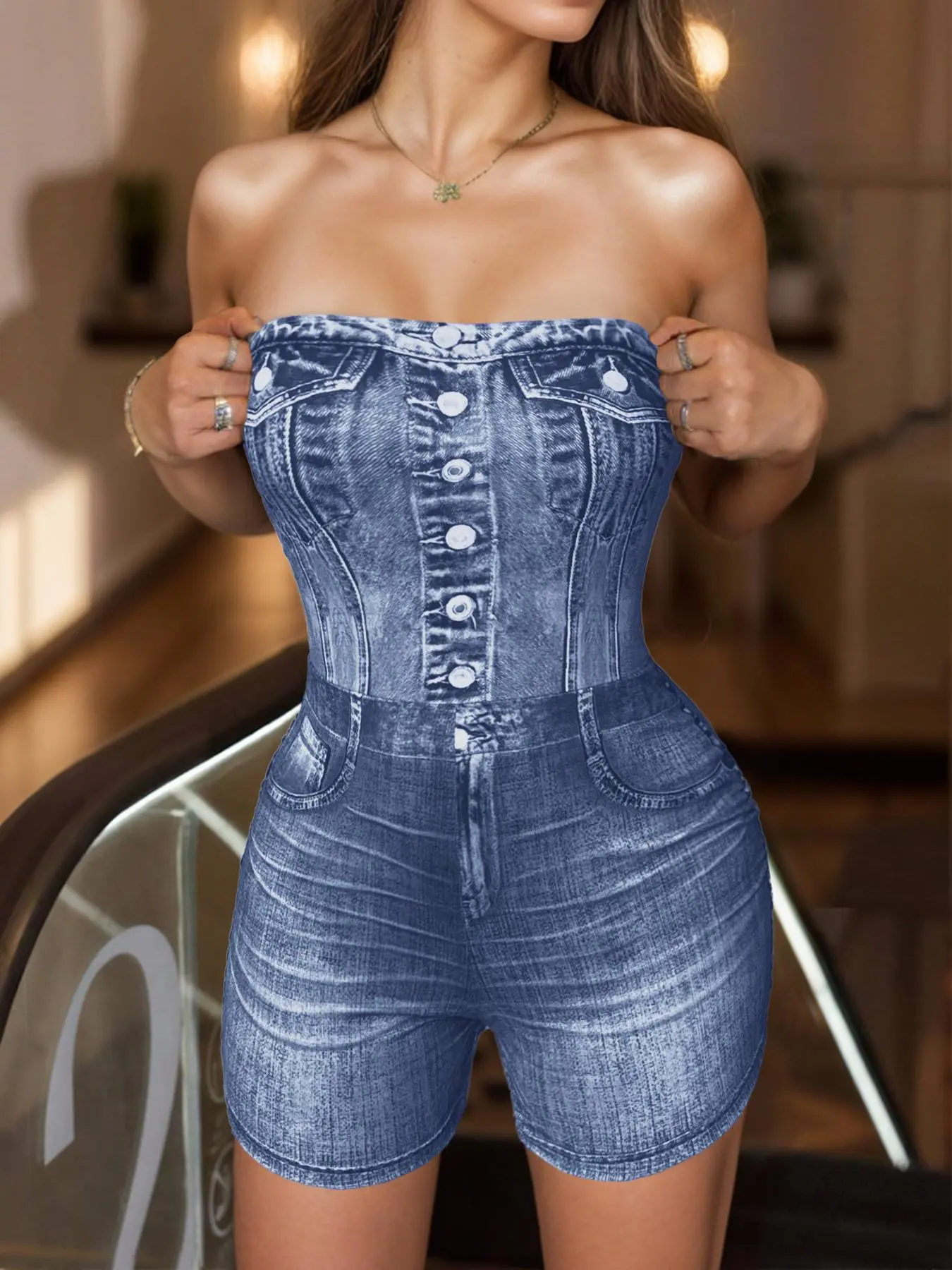 Women's Denim-effect Print Tube Romper, Casual Strapless Skinny Romper for Daily Outdoor Wear, Ladies Clothes for Summer