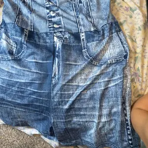 The material is Sooooo much thinner than I thought it was going to be. It's more of a very thin stretch suit instead of jean material. Disappointed in that. I haven't tried it on yet, but going off of holding it in my hand it could possibly be see through, instead of the jean material it advertised.