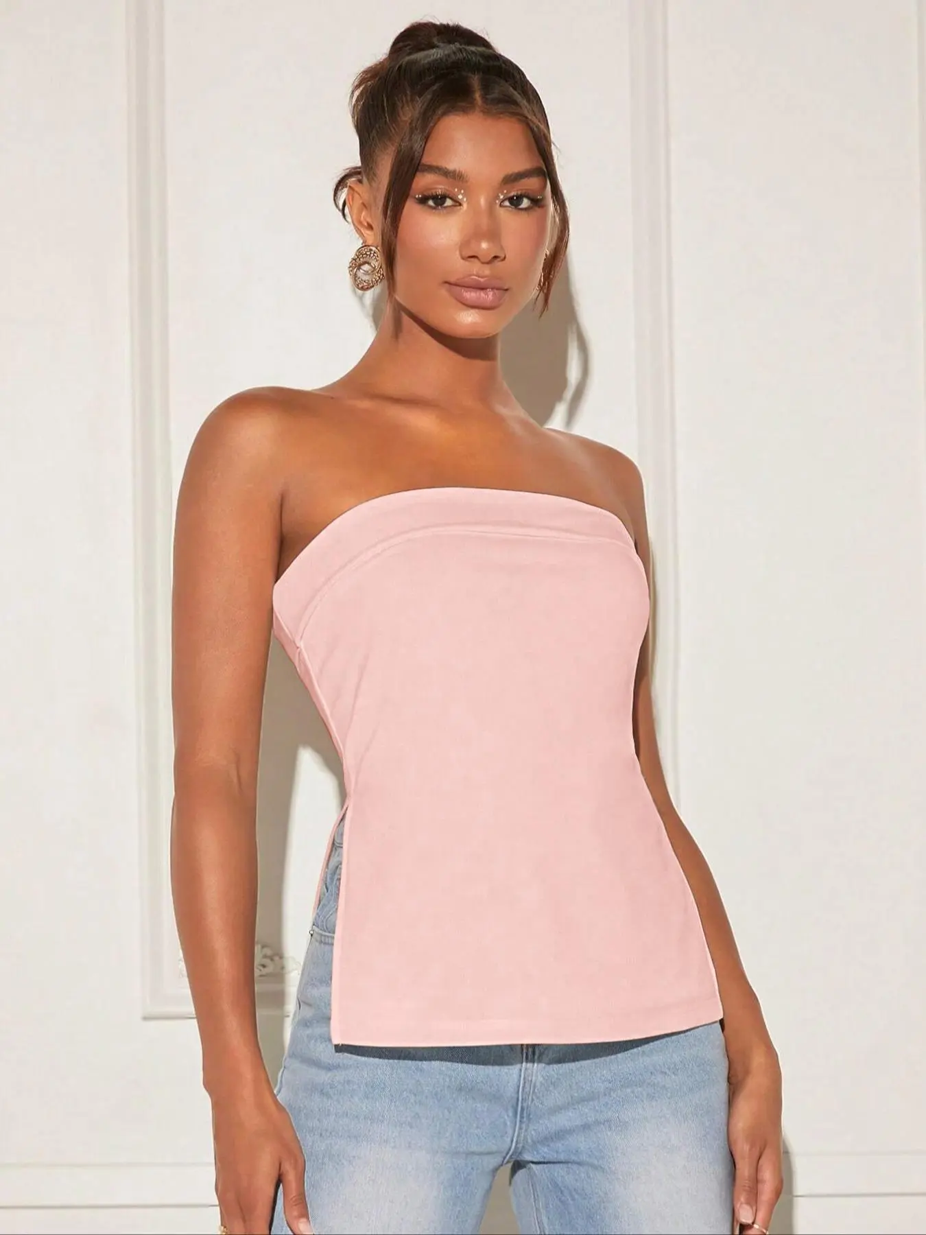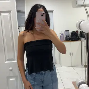 Cute tube top. It has slits on the side of the top. Fabric is soft and stretchy. I am 36C and I ordered a medium. You would need a strapless bra or the adhesive cups. I purchased the sandals from TikTok as well.