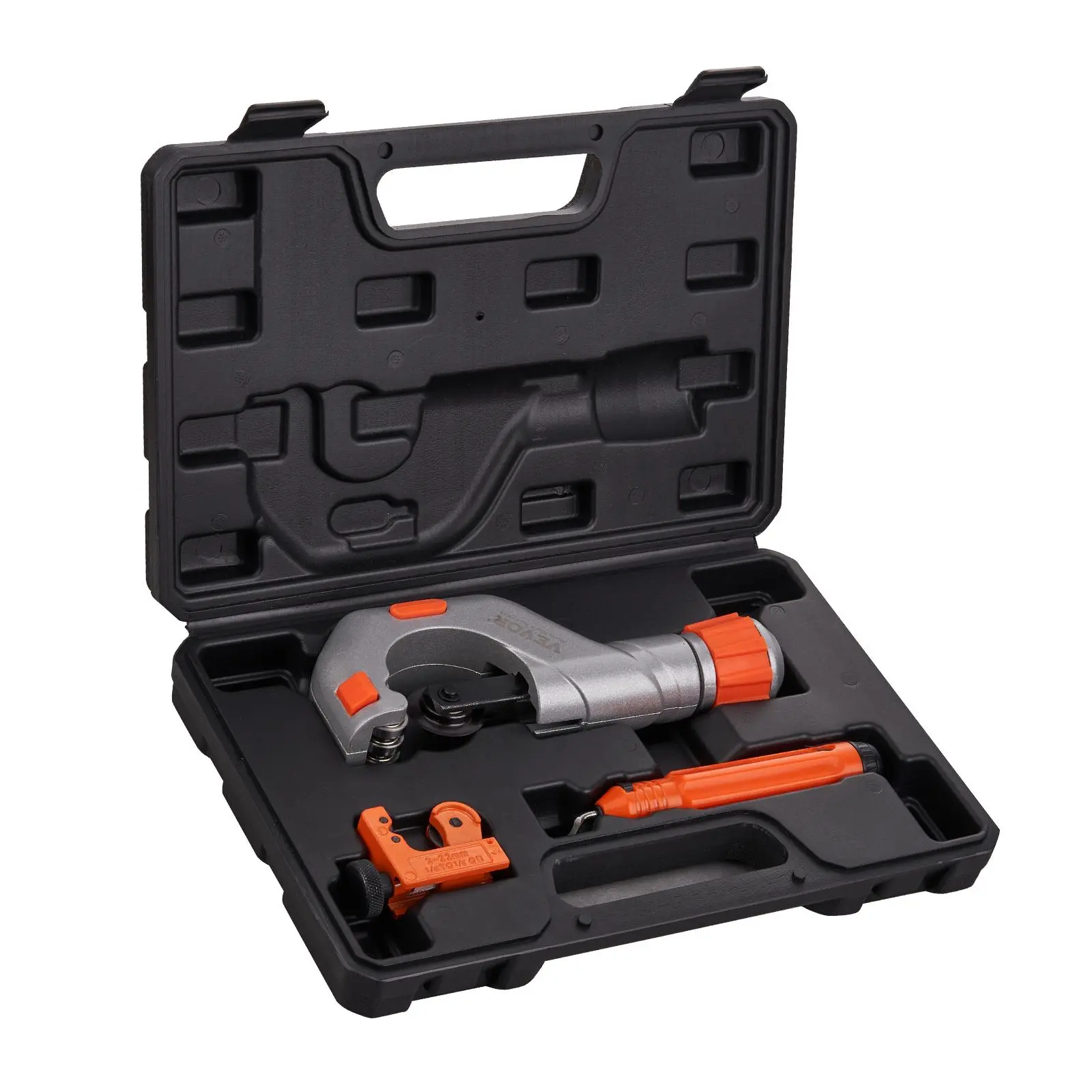 • 3PCS Professional Cutter Set: VEVOR 3pcs tubing cutter set includes a heavy-duty copper pipe cutter, a mini tube cutter, and a deburring tool. The copper pipe cutter is suitable for 3/16" to 2" O.D. pipes with 1/8" max cutting thickness. And the mini pipe cutter can cut 1/8" to 7/8" O.D. pipes with 1/20" max cutting thickness. Perfectly ideal for aluminum, copper, PVC, and thin stainless steel pipes in HVAC, plumbing, construction, air conditioning and heating systems.