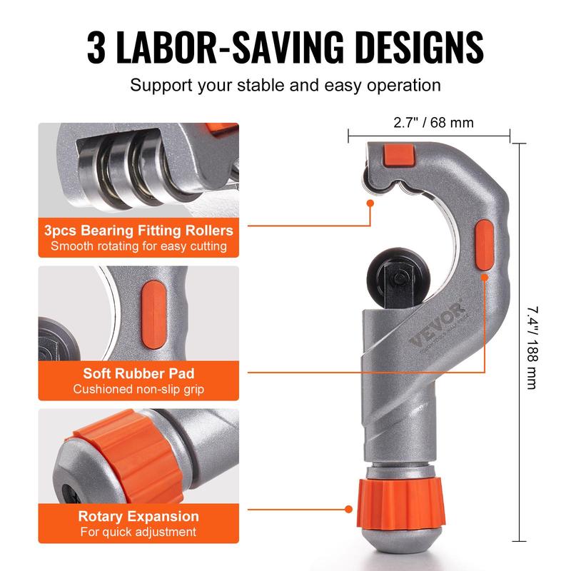 • 3PCS Professional Cutter Set: VEVOR 3pcs tubing cutter set includes a heavy-duty copper pipe cutter, a mini tube cutter, and a deburring tool. The copper pipe cutter is suitable for 3/16" to 2" O.D. pipes with 1/8" max cutting thickness. And the mini pipe cutter can cut 1/8" to 7/8" O.D. pipes with 1/20" max cutting thickness. Perfectly ideal for aluminum, copper, PVC, and thin stainless steel pipes in HVAC, plumbing, construction, air conditioning and heating systems.